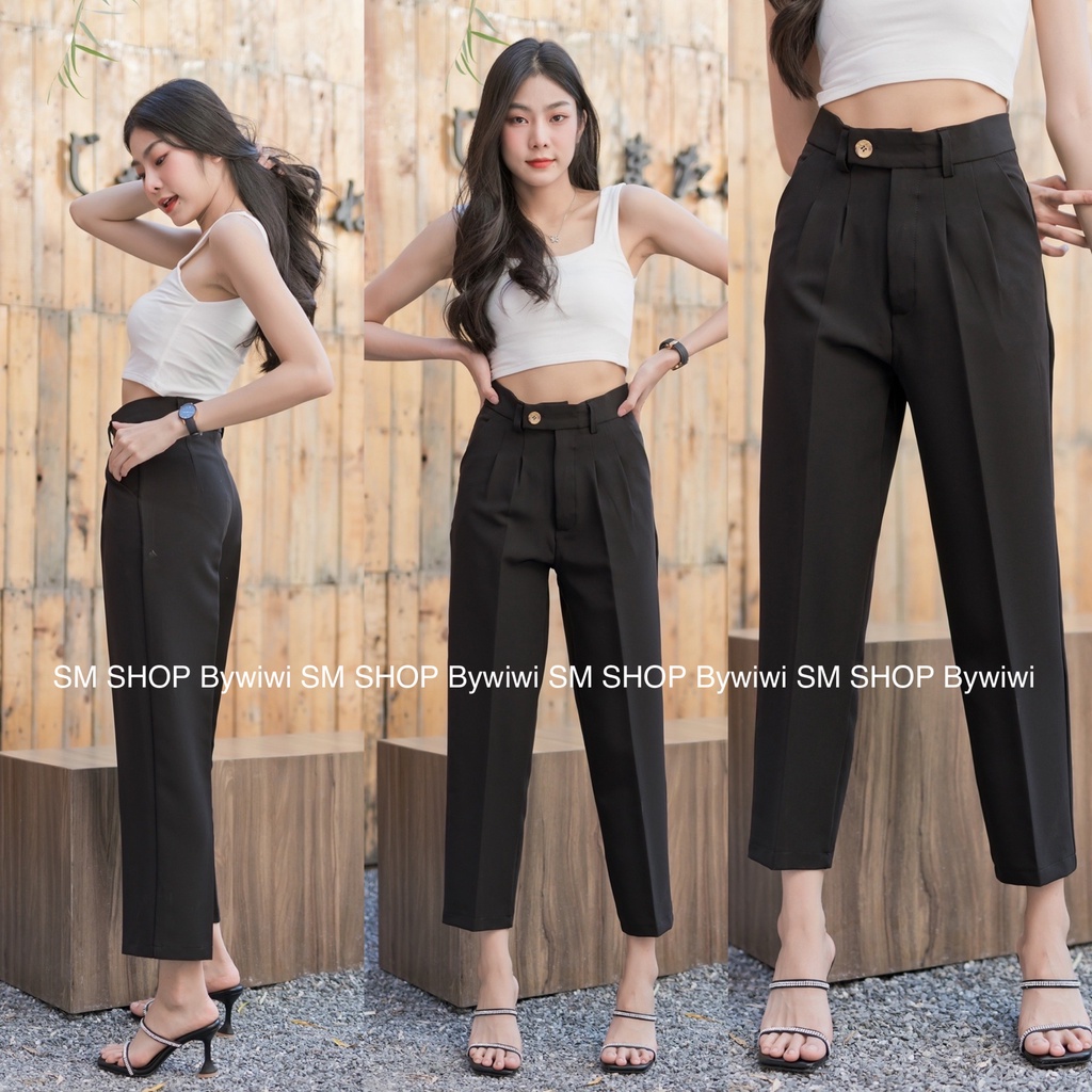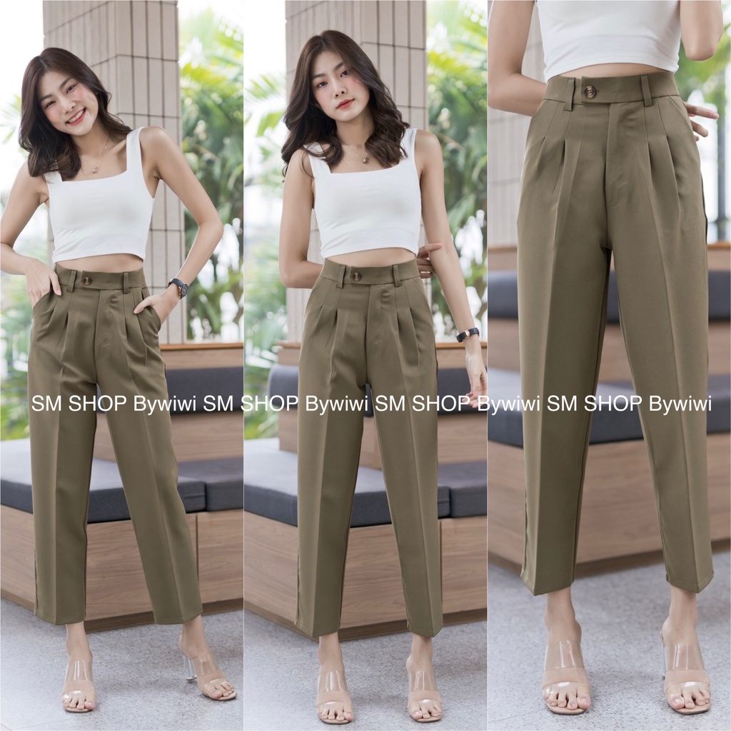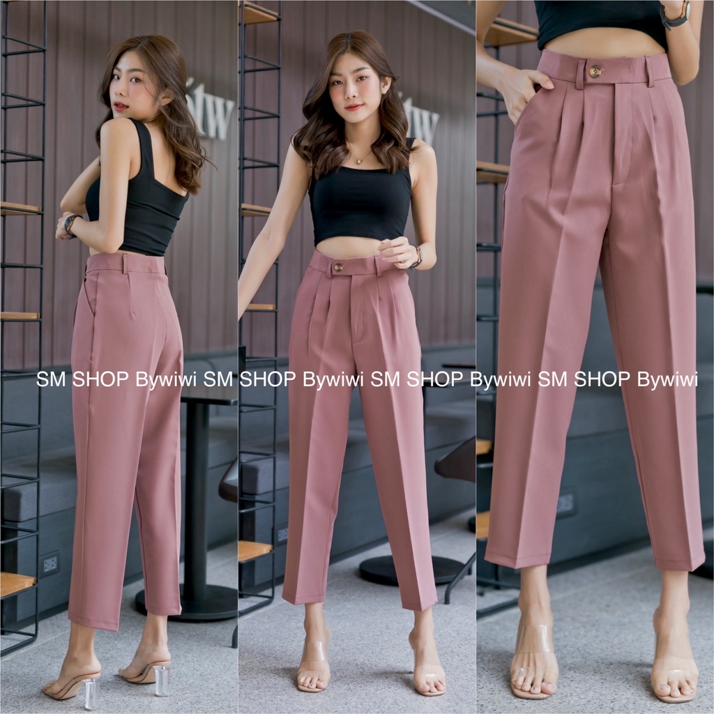 🌈รุ่น BB🌈ใหม่!กางเกงทรงบอยขายาว 9ส่วนเอวสูงขอบยื่นกระดุมหน้า ผ้าไอวี่หรือผ้าเปเป้ S-2XL มีเก็บเงินปลายทาง