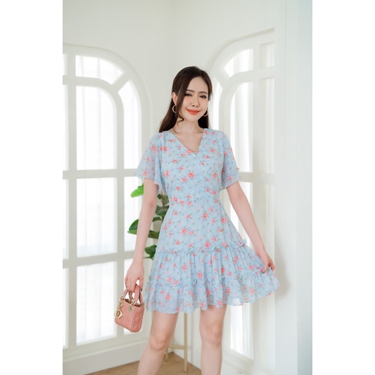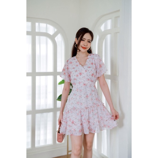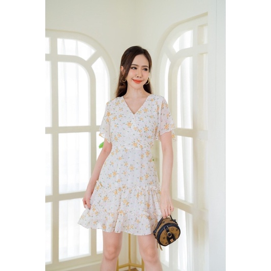 เดรสชีฟองคอวี แต่งระบายชายกระโปรง