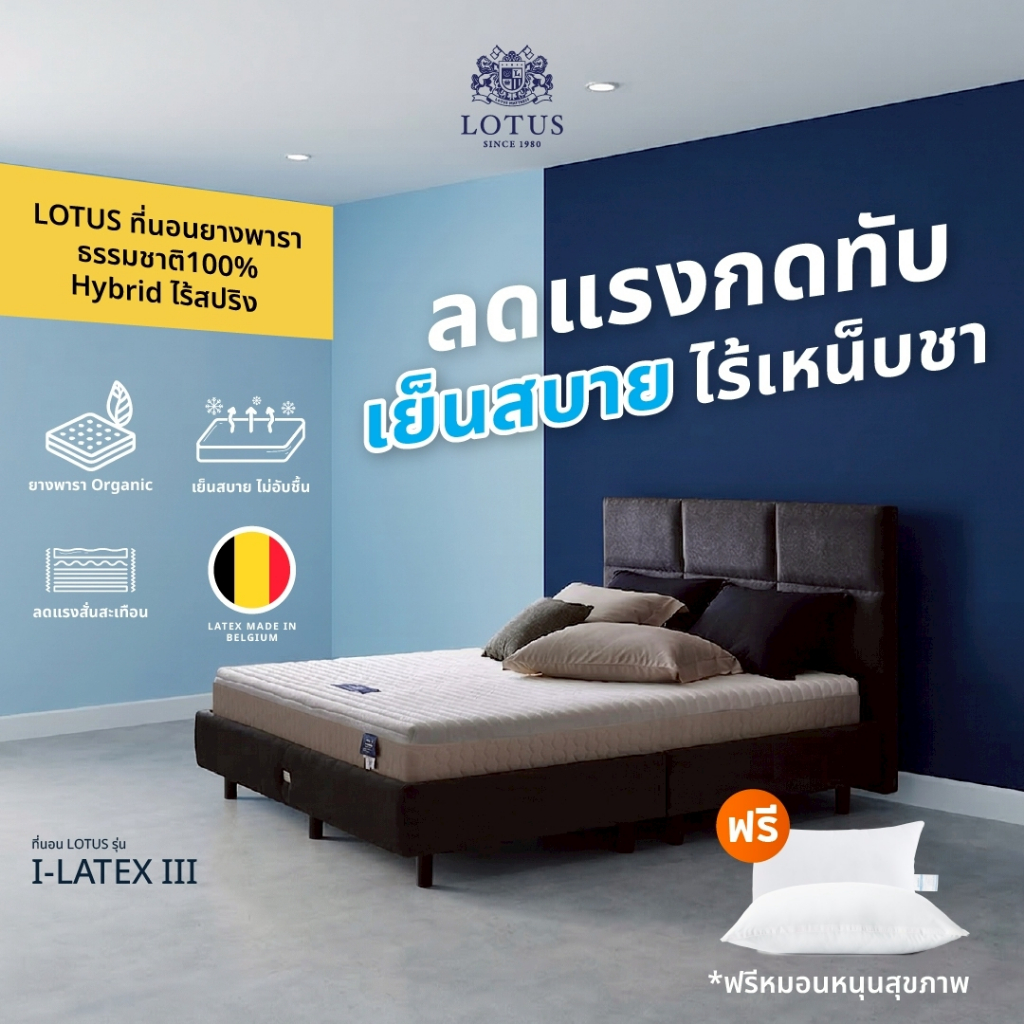 LOTUS ที่นอนยางพาราธรรมชาติ100% รุ่น i-Latex III หนา 9 นิ้ว โอบรับทั้งตัว หลับลึกถึงเช้า ฟรีหมอนสุขภาพ ส่งฟรี