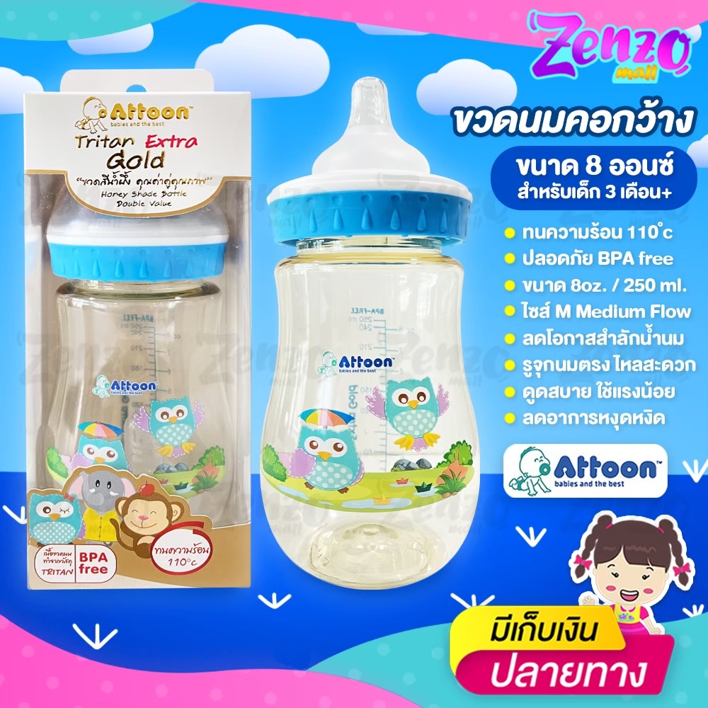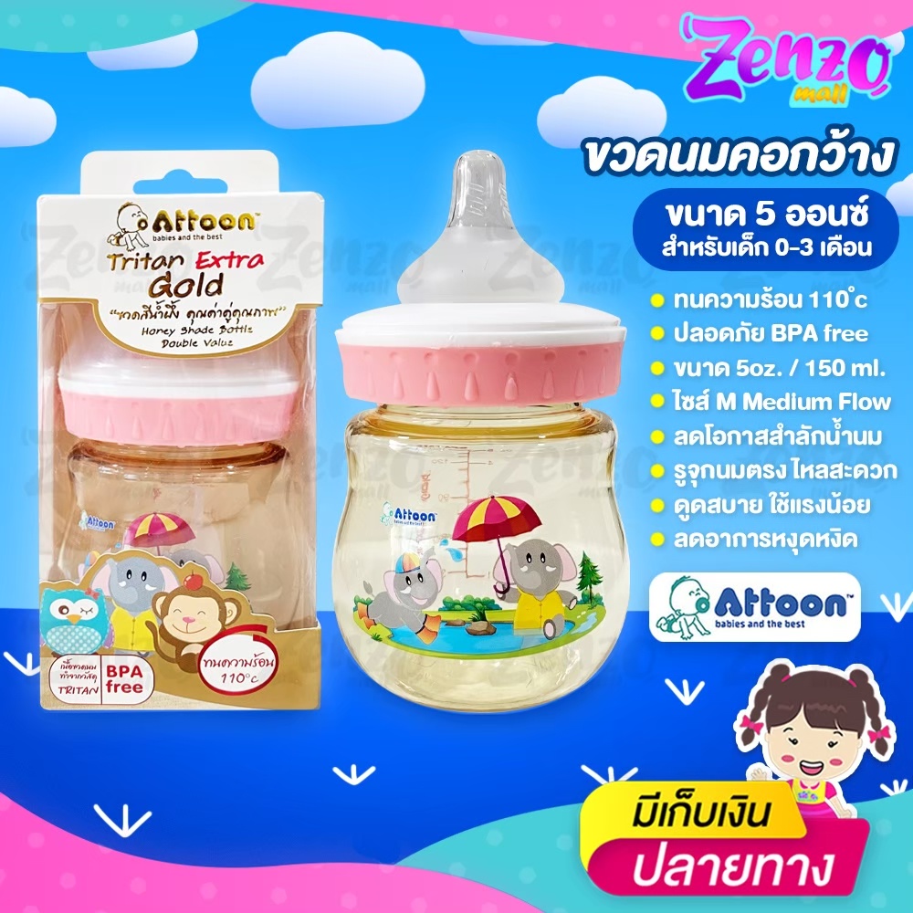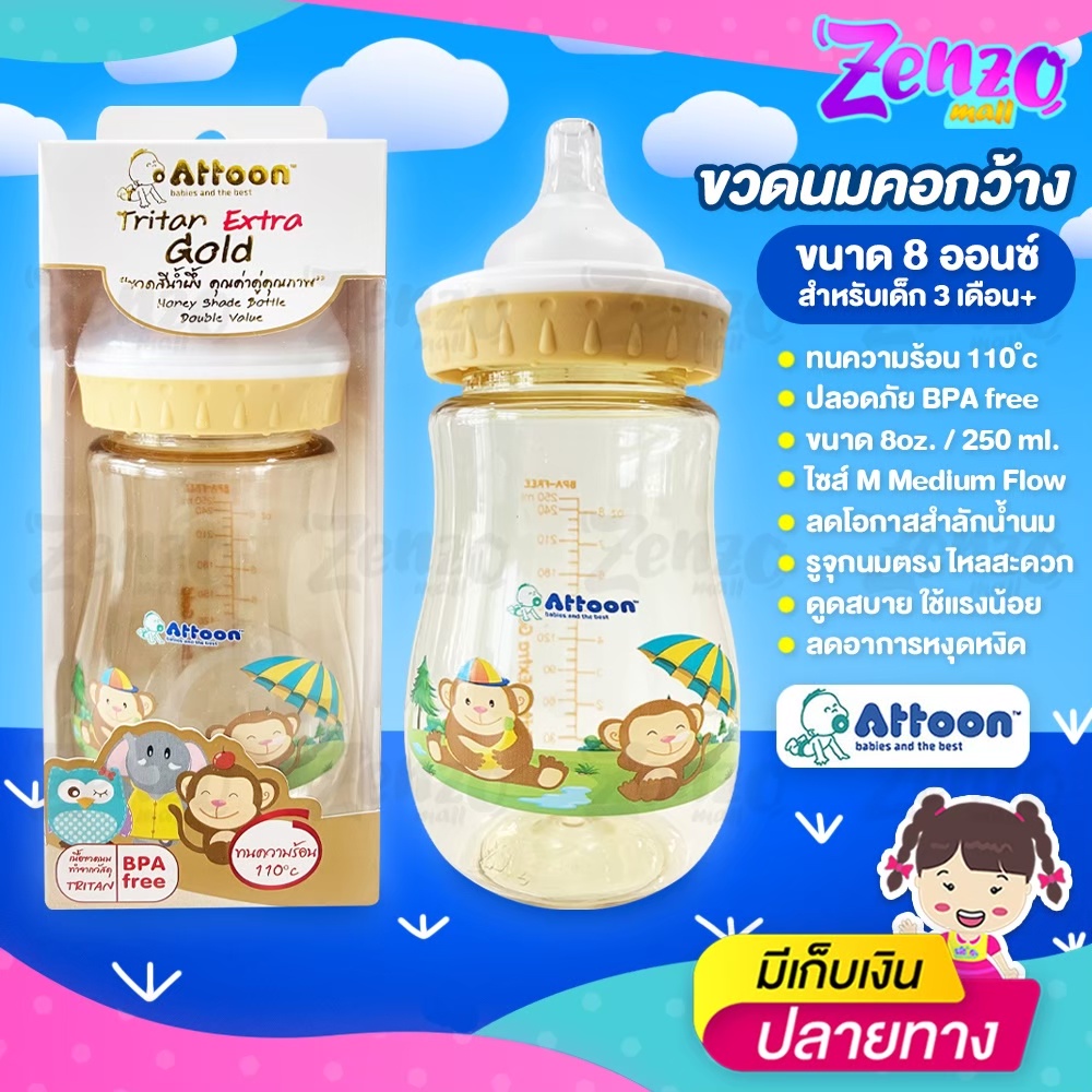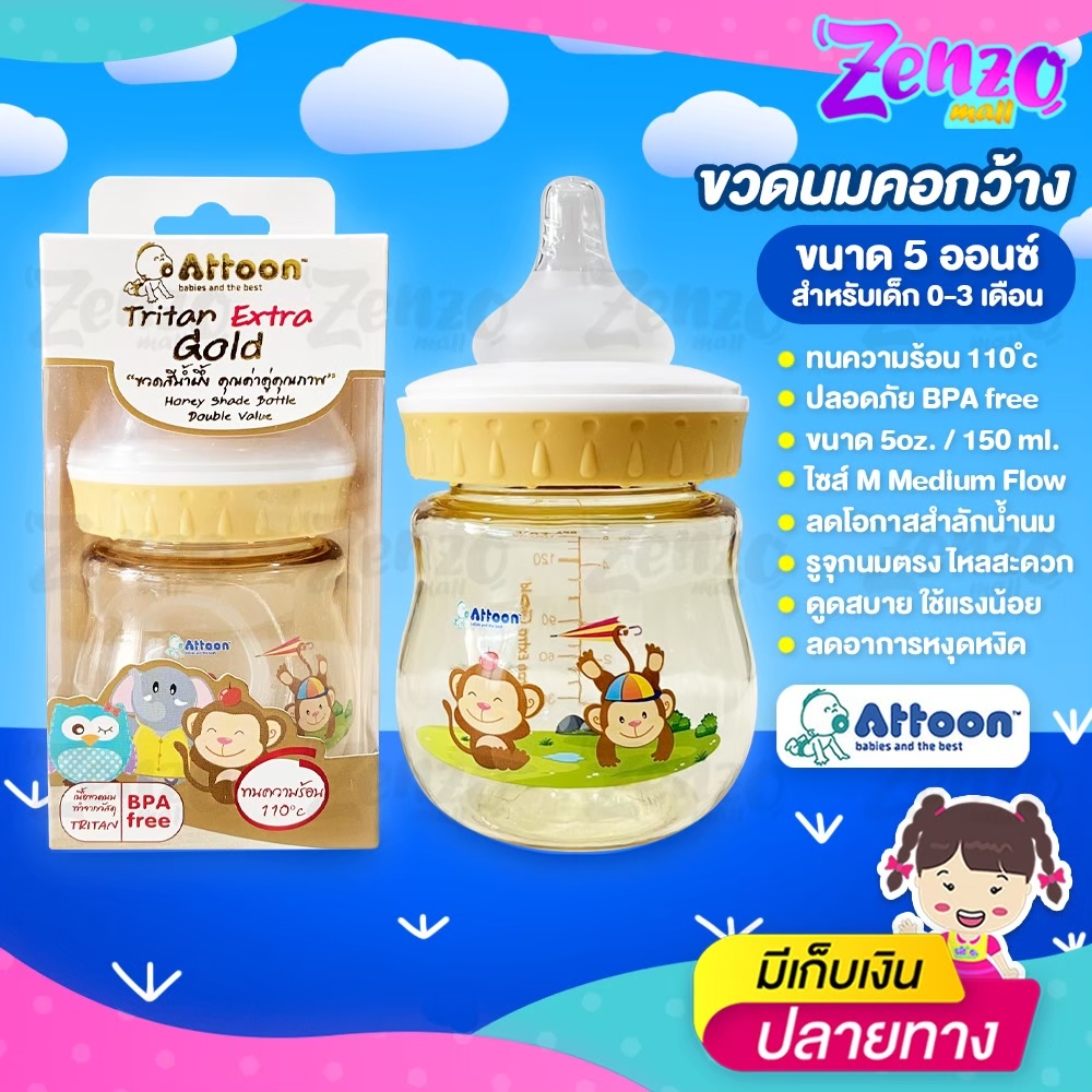 ขวดนม Attoon Tritan Extra Gold ขวดคอกว้างสีน้ำผึ้ง ขนาด 5 ออนซ์ / 8 ออนซ์ ปราศจากสาร BPA ปลอดภัยต่อลูกน้อย