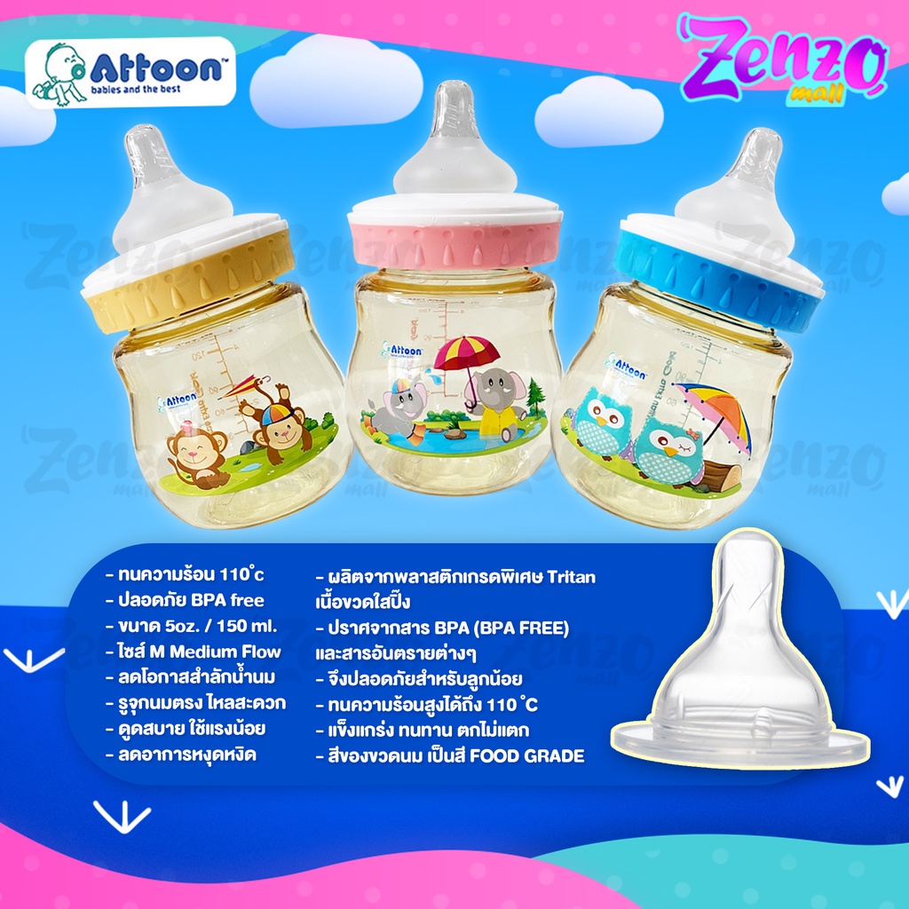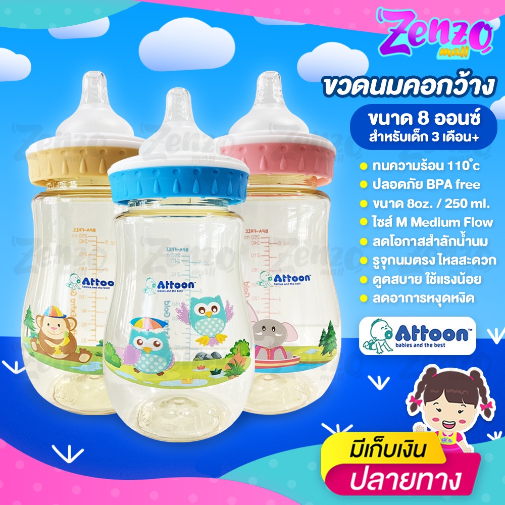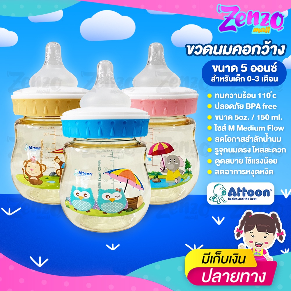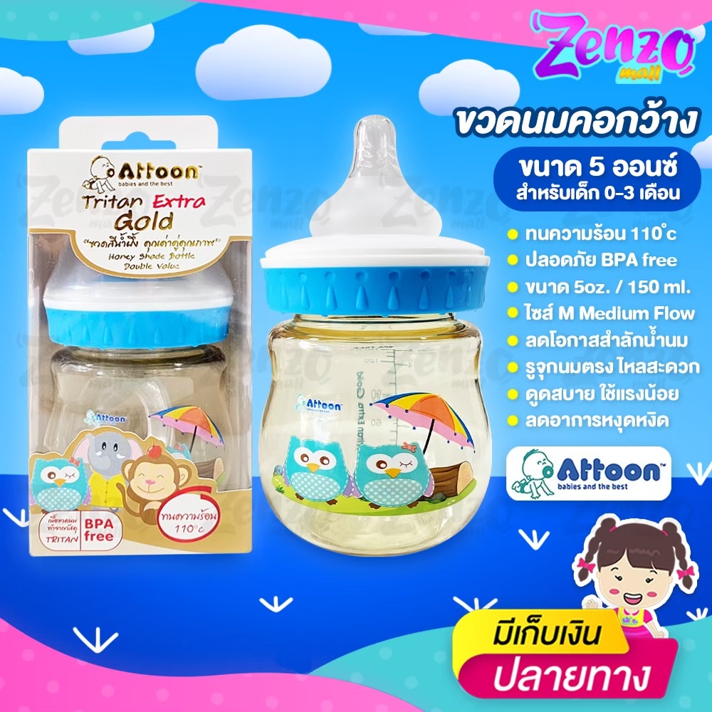 ขวดนม Attoon Tritan Extra Gold ขวดคอกว้างสีน้ำผึ้ง ขนาด 5 ออนซ์ / 8 ออนซ์ ปราศจากสาร BPA ปลอดภัยต่อลูกน้อย