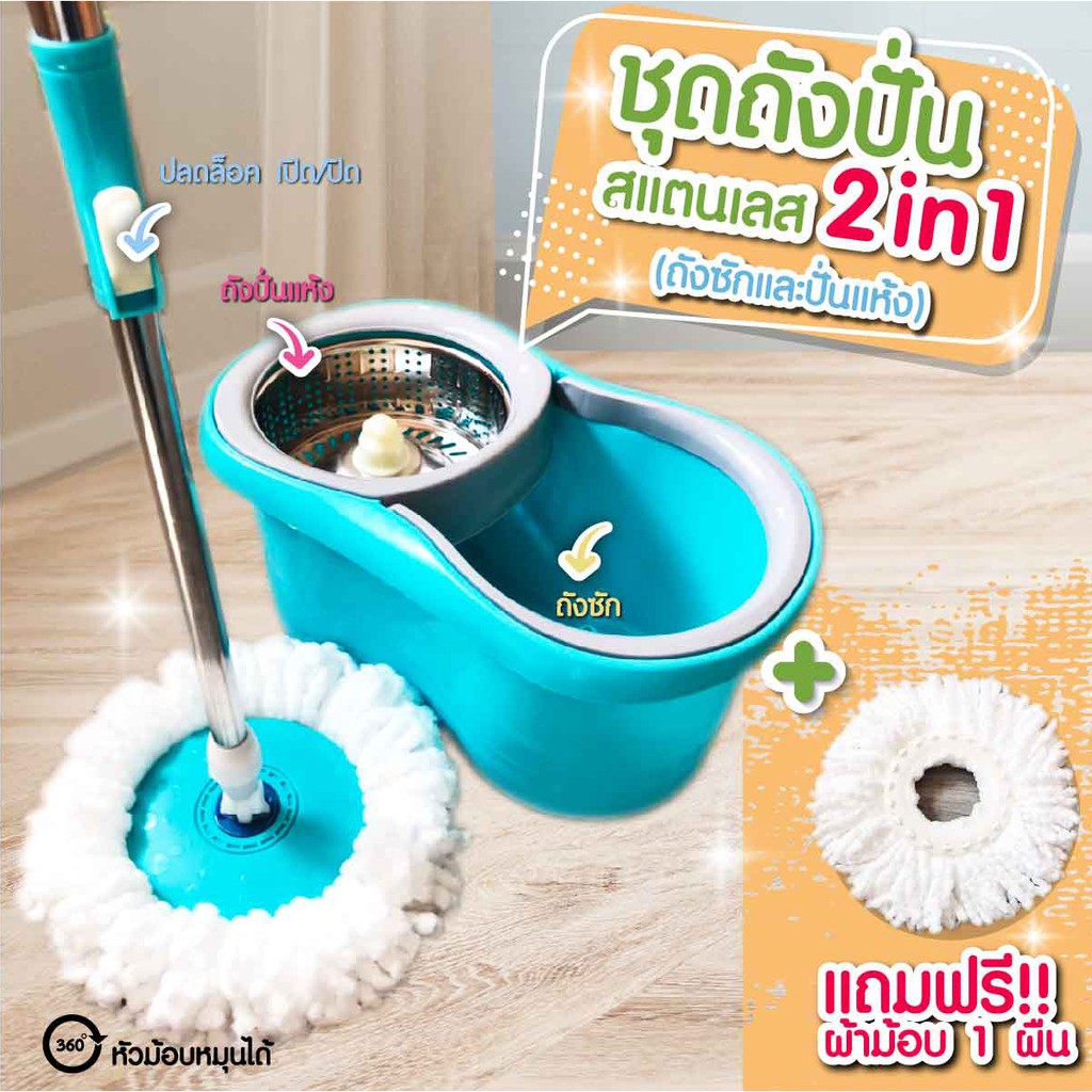 💥พร้อมส่ง💥ไม้ถูพื้น Spin Mop ชุดถังม๊อบ ไม้ม๊อบ ชุดไม้ม๊อบถูพื้น ไม้ม๊อบถูพื้นพร้อมถังปั่นสแตนเลส 📌ฟรีผ้า 2 ผืน📌
