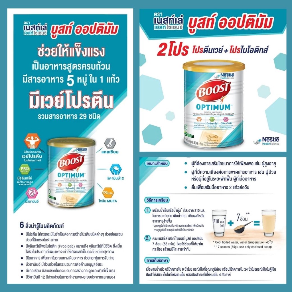 Boost Optimum บูสท์ ออฟติมั่ม มีเวย์โปรตีน อาหารสำหรับผู้สูงอายุ 800กรัม วนิลา 2941/ ธัญพืช 9814