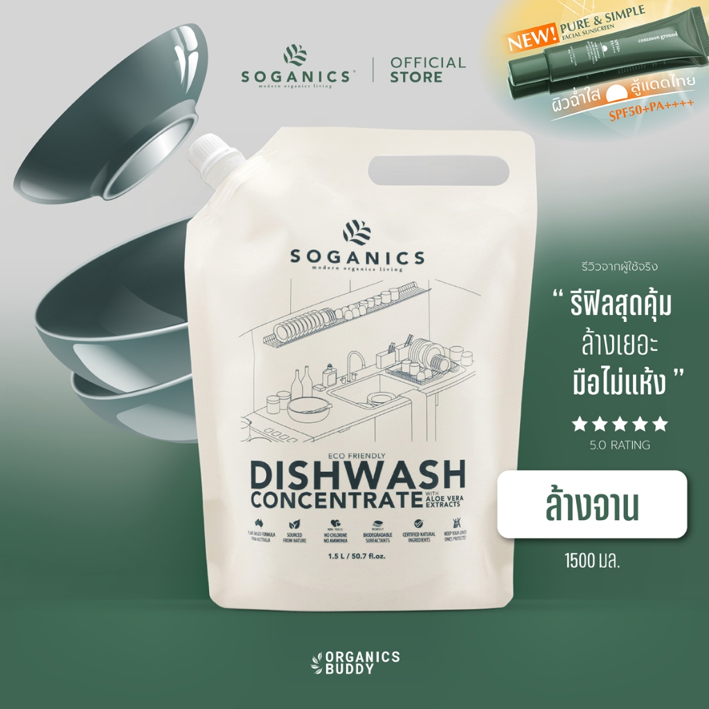 SOGANICS Dishwash Concentrate น้ำยาล้างจาน Aloe Vera Extract ถนอมมือ ไม่ทิ้งคราบ (Refill รีฟิล) 1.5L