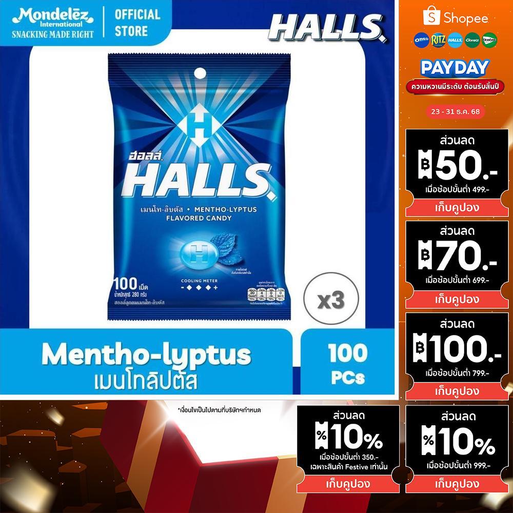 [แพ็ค 3 ถุง] Halls Mentho-Lyptus ฮอลล์ ลูกอมเมนโทลิบตัส แบบถุง 100 เม็ด (280 กรัม)
