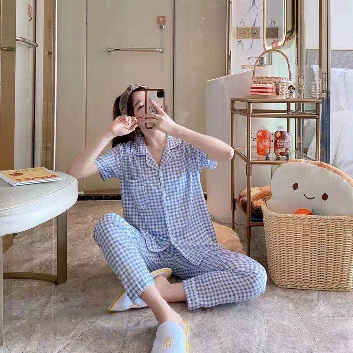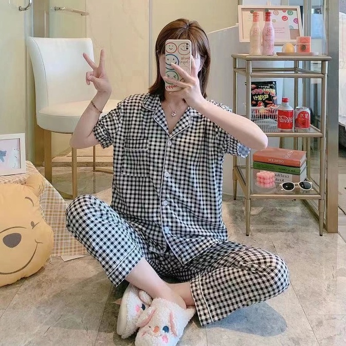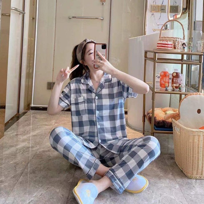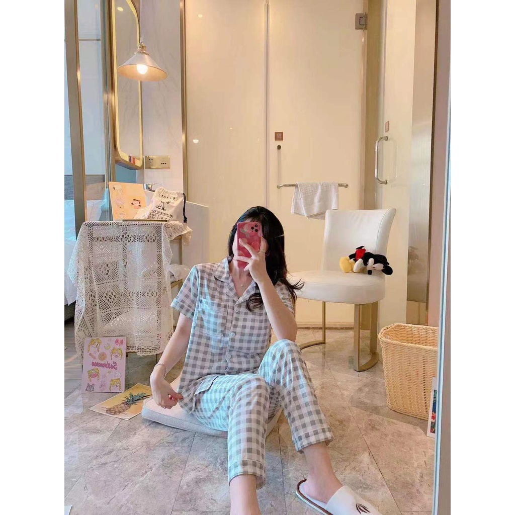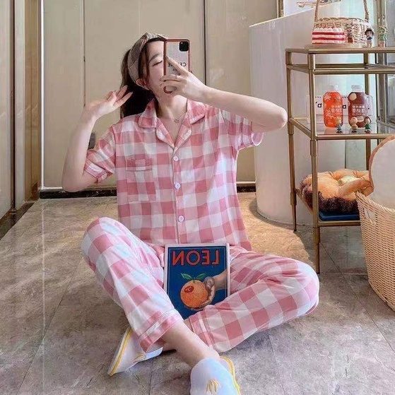 พร้อมส่ง:ชุดนอนผ้าคอตตอนลายสก๊อตแขนสั้นขายาว ชุดนอนเสื้อแขนสั้น มี กระดุม คอปก และกางเกงขายาว ลายสก๊อต สีน่ารักสดใส