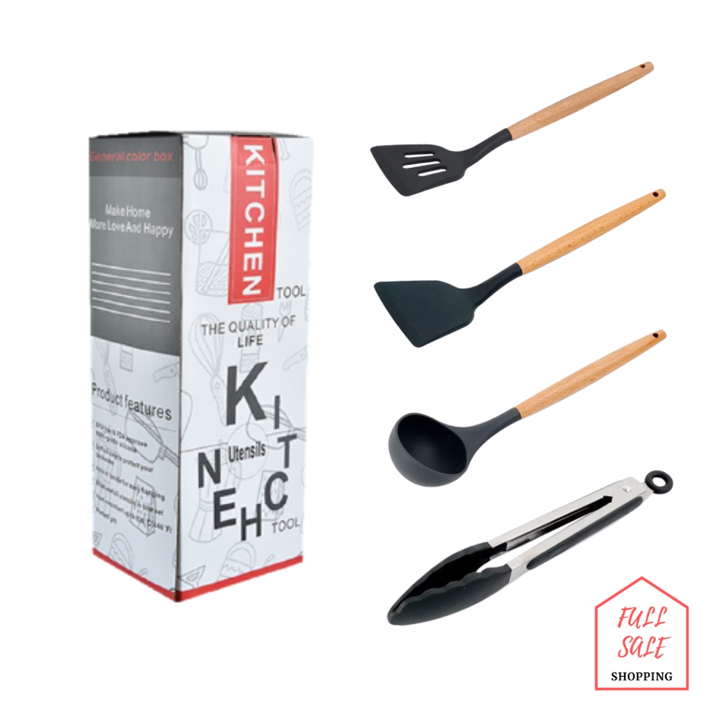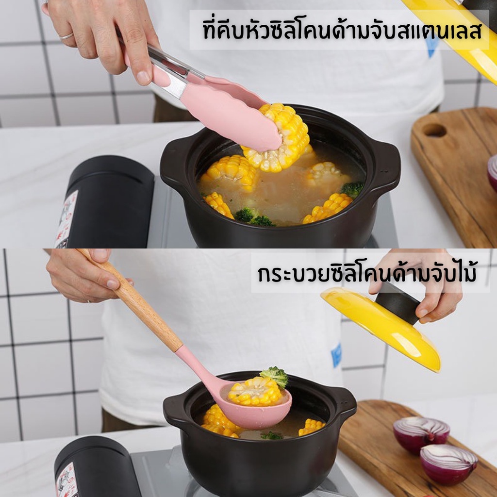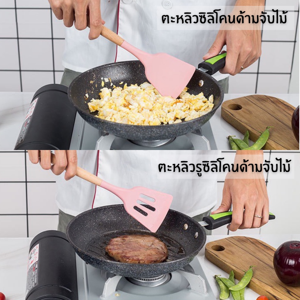 ใส่โค้ท 82HY9C ลด 40.- 🍳 ชุดตะหลิวซิลิโคนแท้ ด้ามจับไม้ ทนความร้อนไม่ละลาย กระทะไม่เป็นรอย