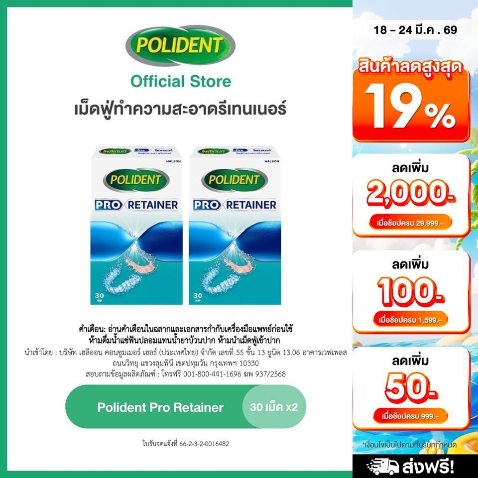 POLIDENT PRO RETAINER 30'S X 2 โพลิเดนท์ โปร รีเทนเนอร์ เม็ดฟู่ทำความสะอาด 30 เม็ด แพ็ค 2 ขาว