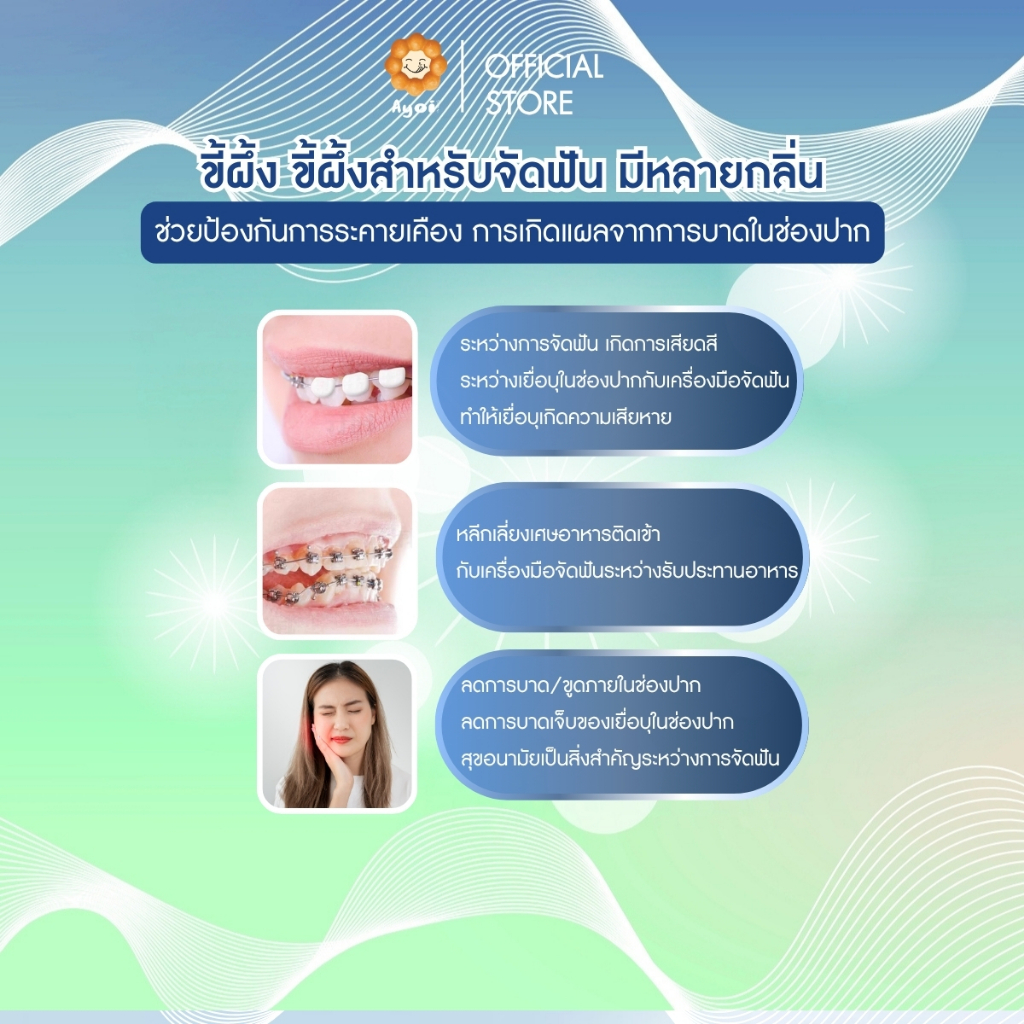 ขี้ผึ้ง ขี้ผึ้งสำหรับจัดฟัน มีหลายกลิ่น ช่วยป้องกันการระคายเคือง การเกิดแผลจากการบาดในช่องปาก (P16)