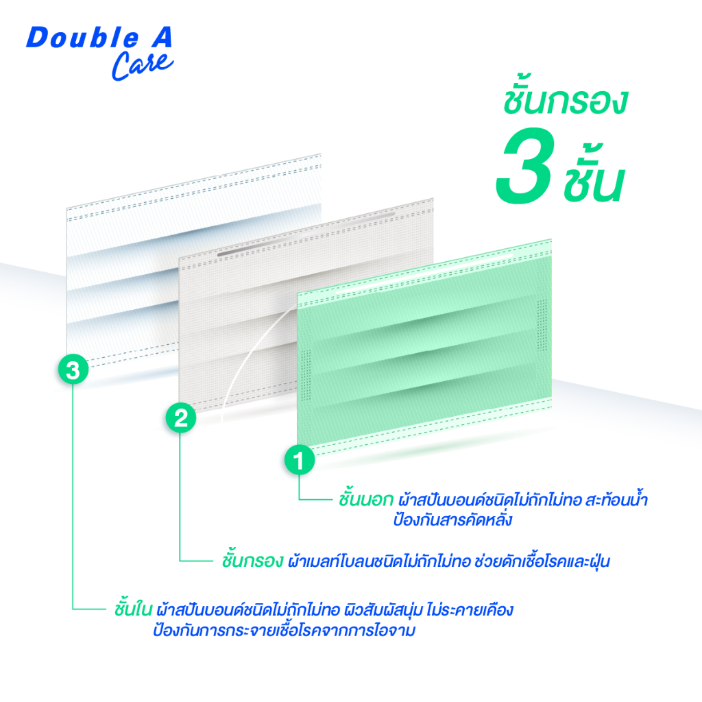 [สีเขียว 50 ชิ้น แบบกล่อง] Double A Care หน้ากากอนามัยทางการแพทย์ชนิดยางยืด 3 ชั้น สีเขียว SURGICAL MASK 3 PLY 50 ชิ้น