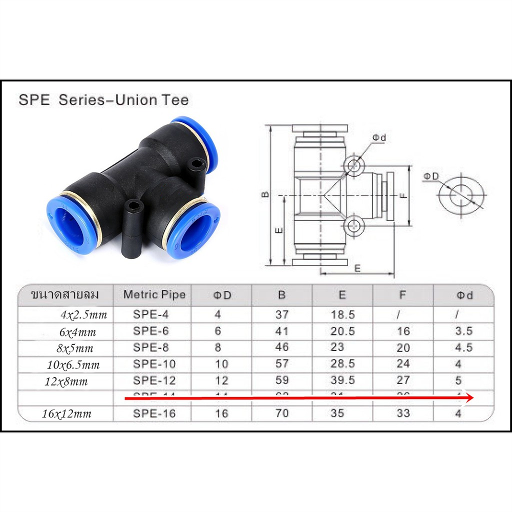 SPE ข้อต่อลมนิวเมติกส์แบบสามทาง ขนาดเท่ากันทั้ง 3 ด้าน ทรง T ฟิตติ้งลม 3 ทาง SPE-4,SPE-6,SPE-8,SPE-10,SPE-12,SPE-16
