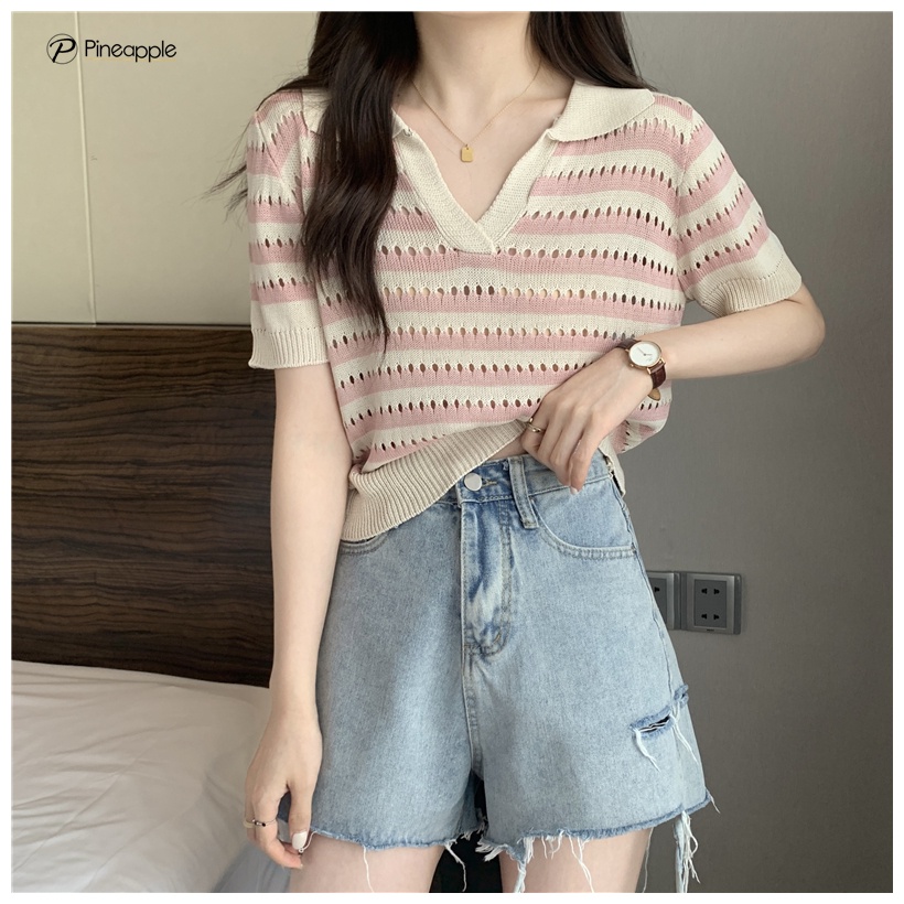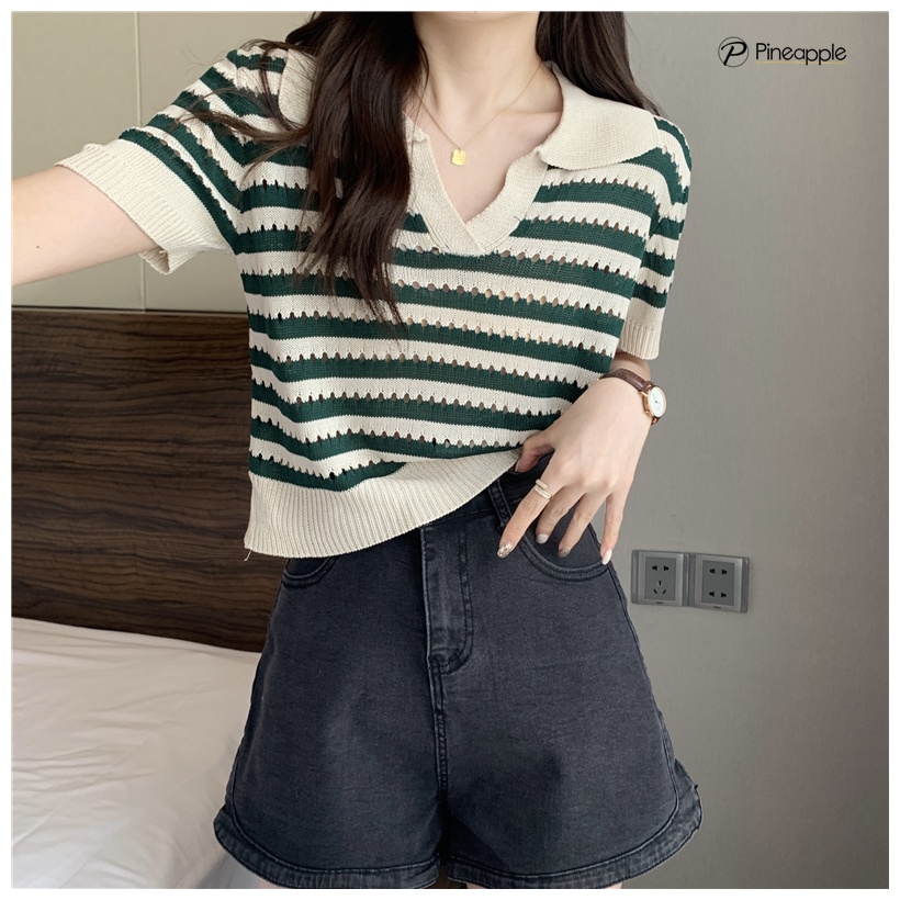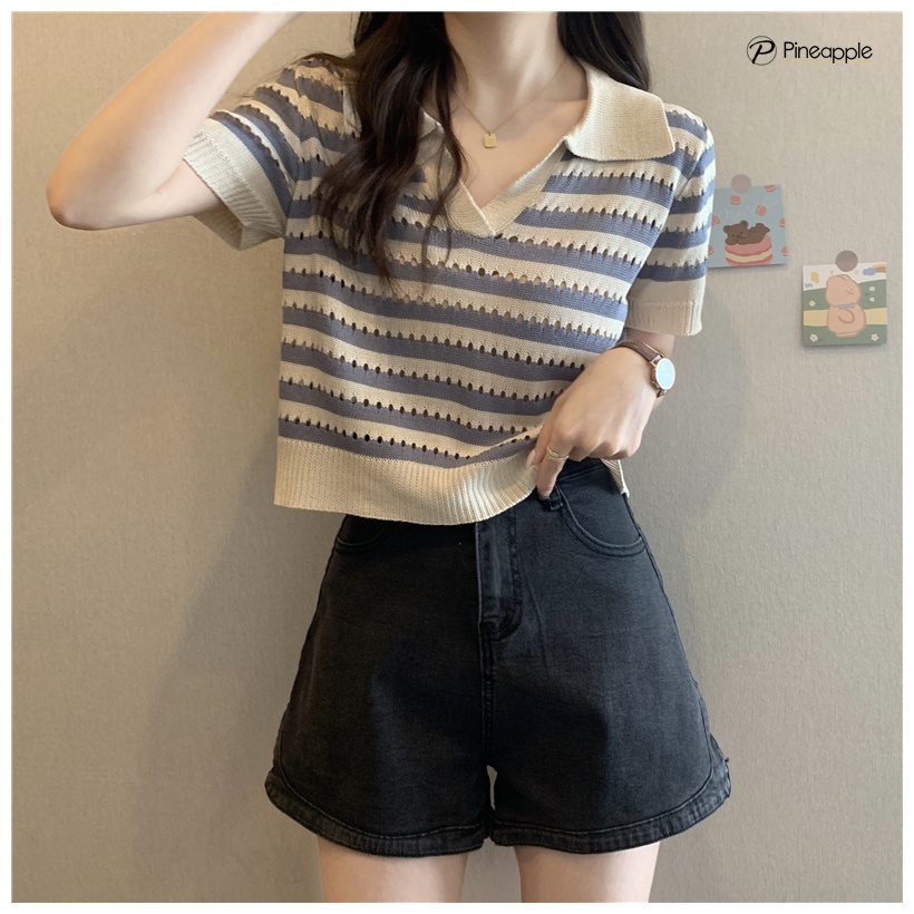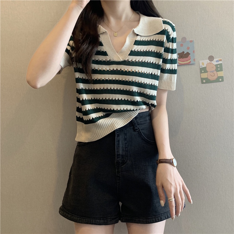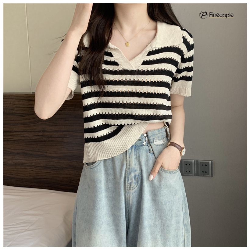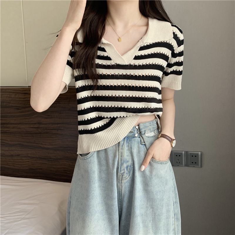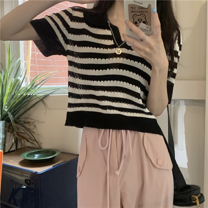 H337 เสื้อไหมพรมแขนสั้นคอปกซีทรูใส่สบายระบายดีมากสวยงาม เสื้อครอปถัก เสื้อลายทาง