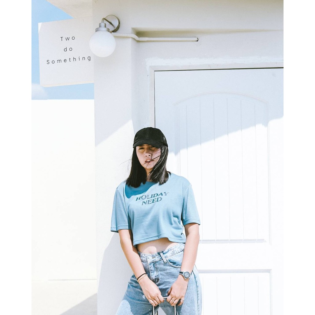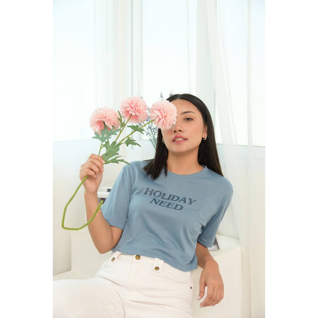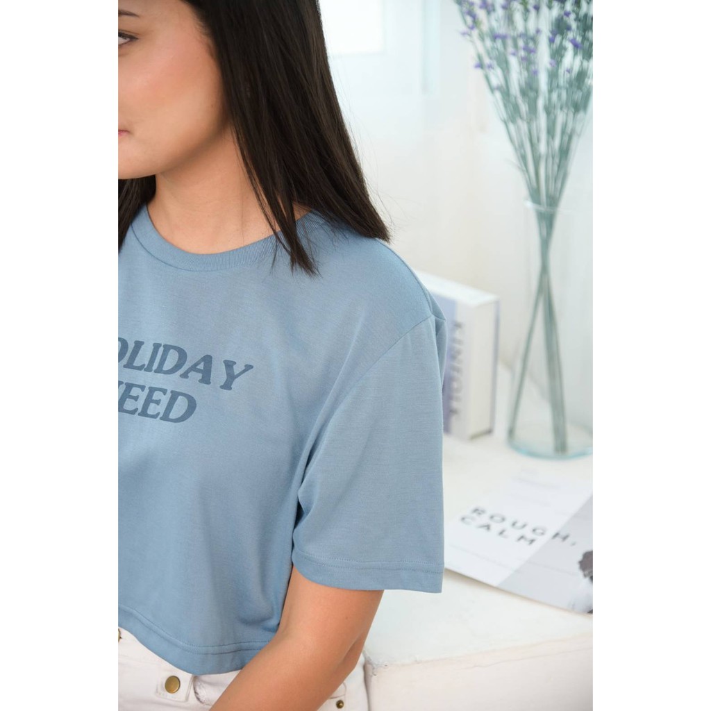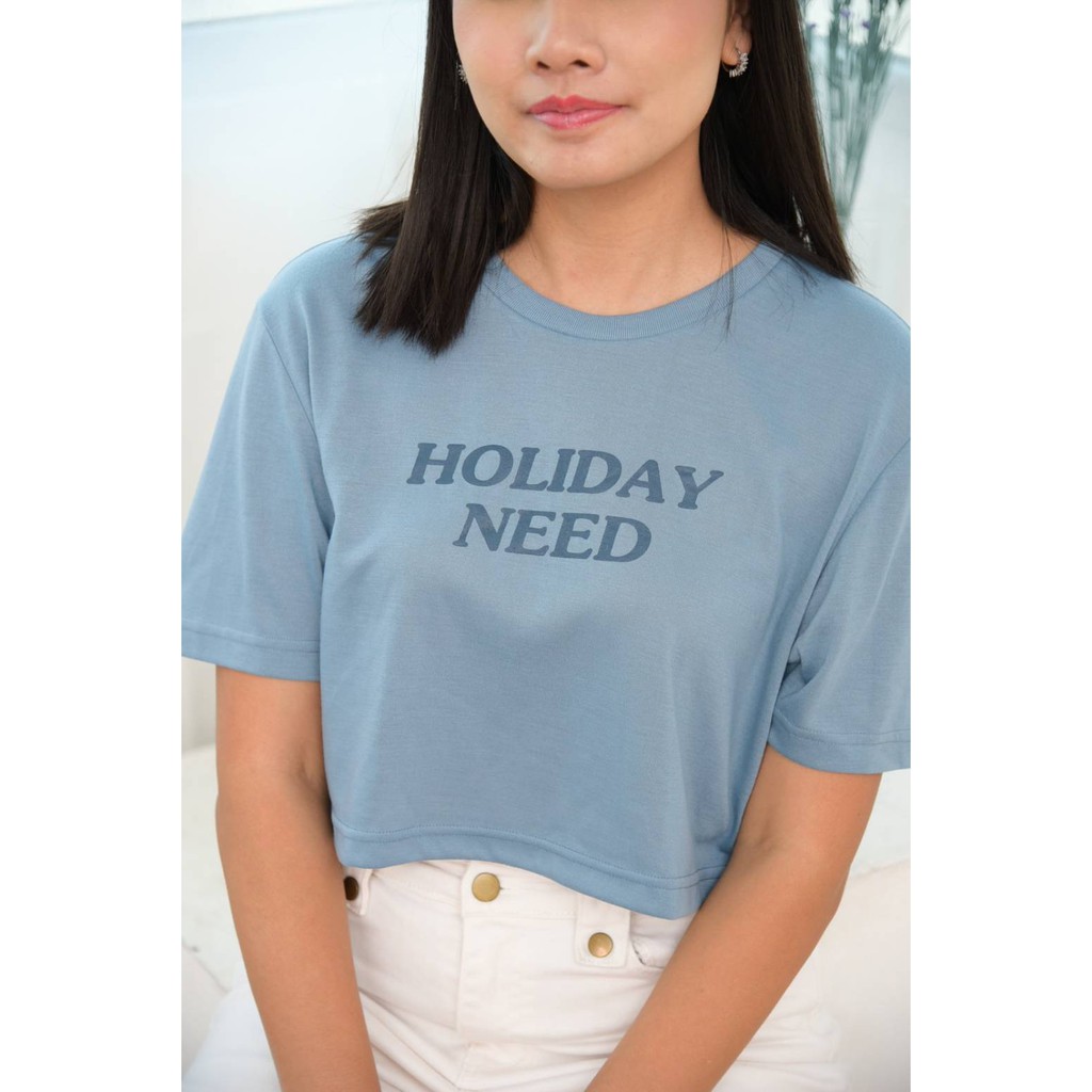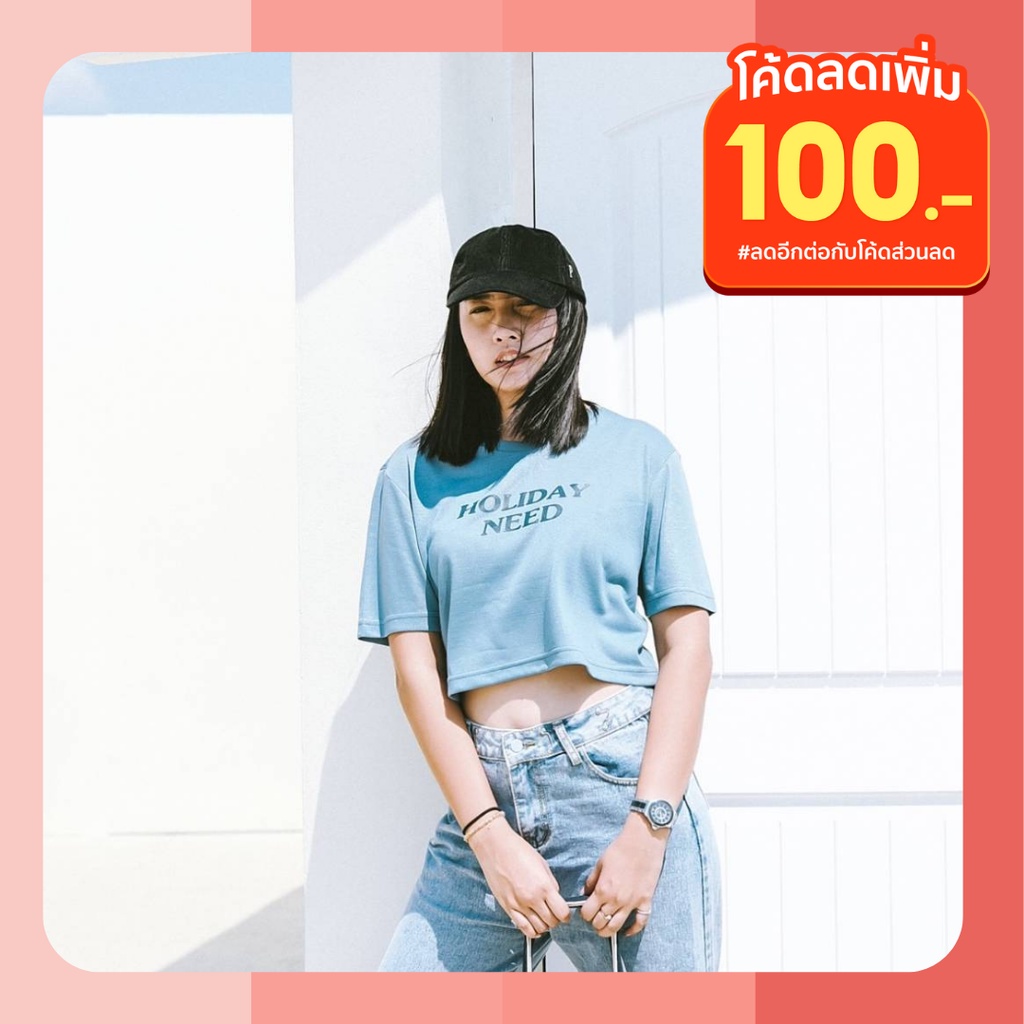 Threemore เสื้อครอปผู้หญิงผ้ายืดพิมพ์ลายมินิมอล Holiday Need