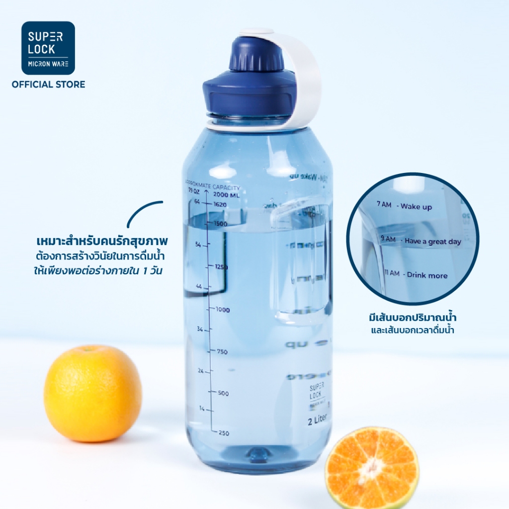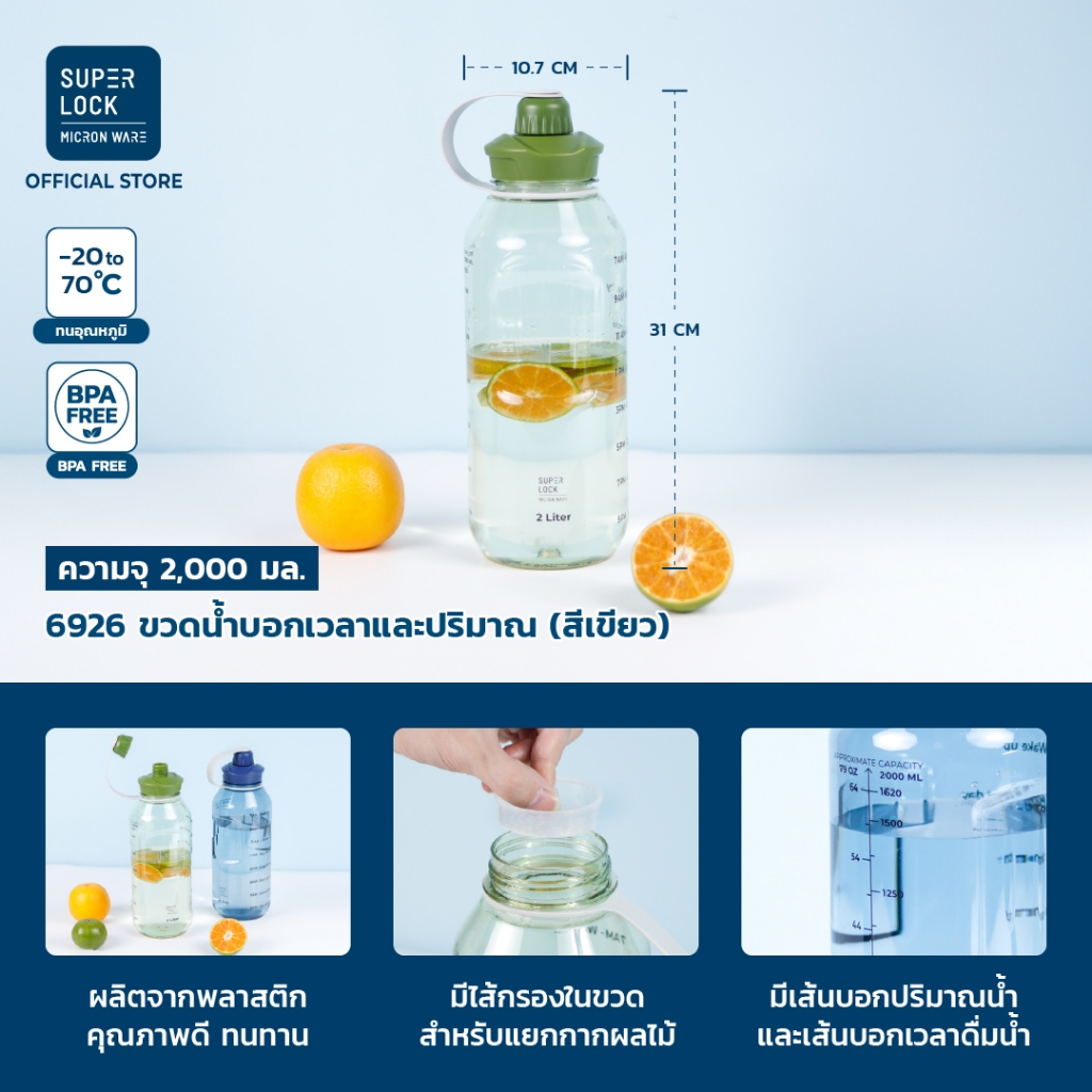 Super Lock ขวดน้ำพกพา บอกเวลาดื่มและปริมาณน้ำ 2 ลิตร กระบอกน้ำบอกเวลา มีไส้กรองแยกกากมี 2 สี 6926
