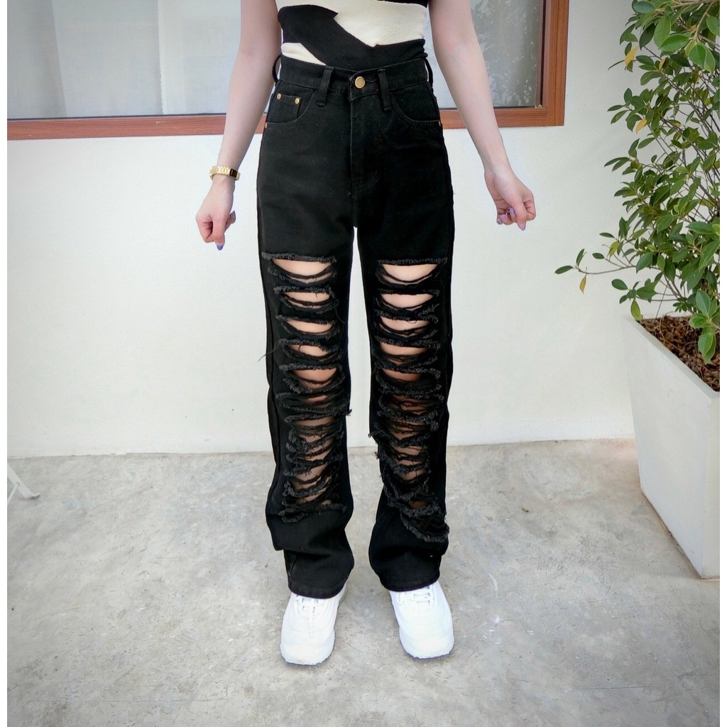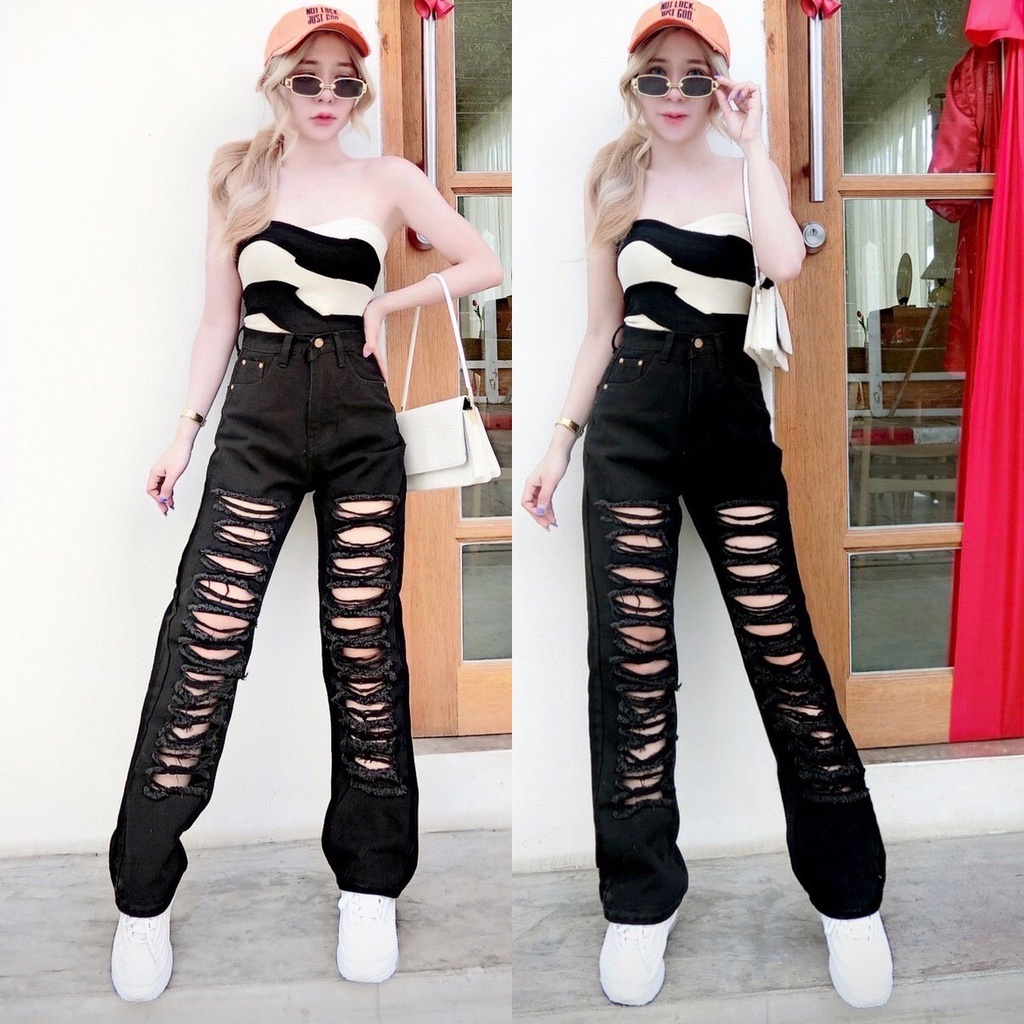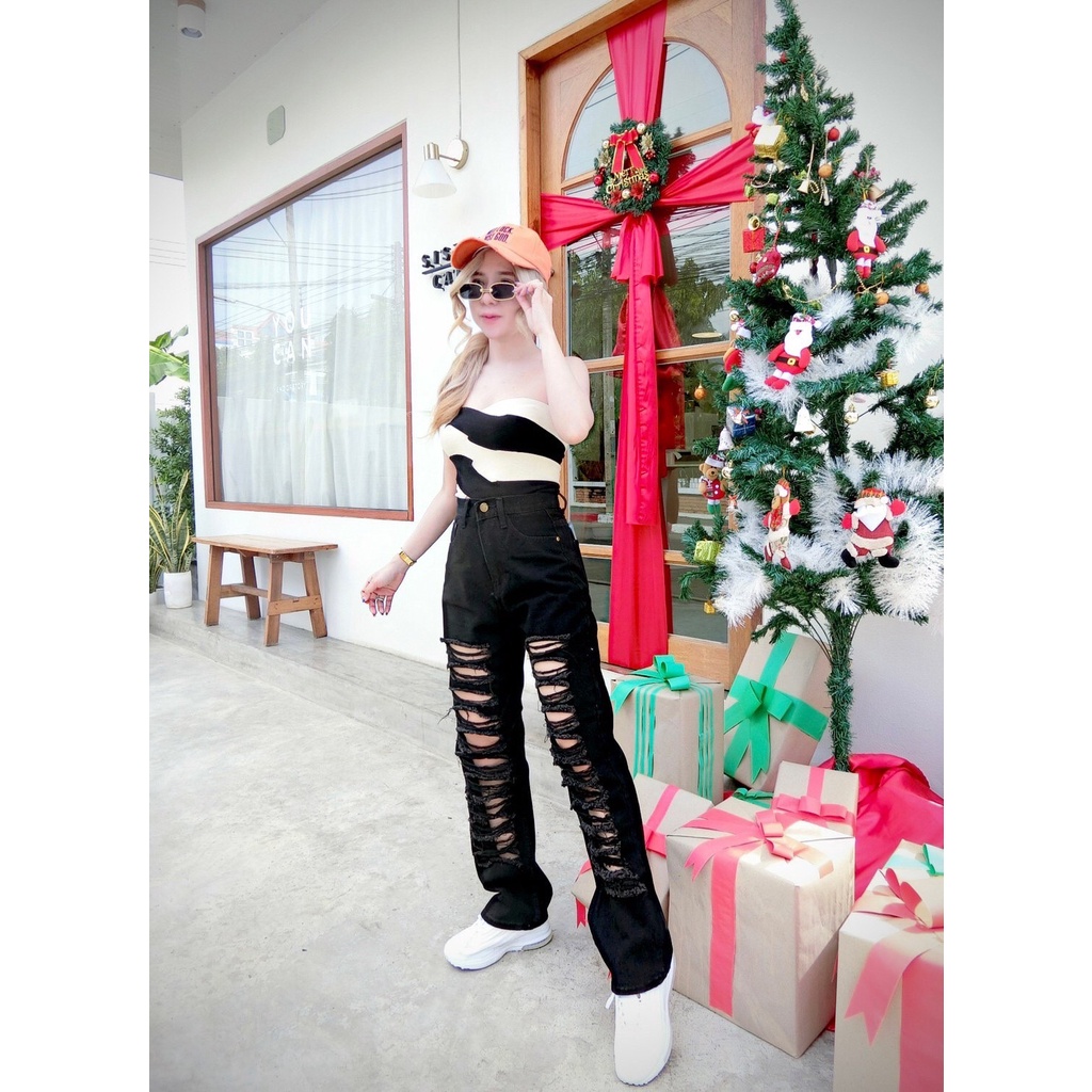 Cc jeans 195 S-5XL กางเกงยีนส์ผู้หญิง ทรงกระบอก เอวสูง แต่งขาดแฟชั่น