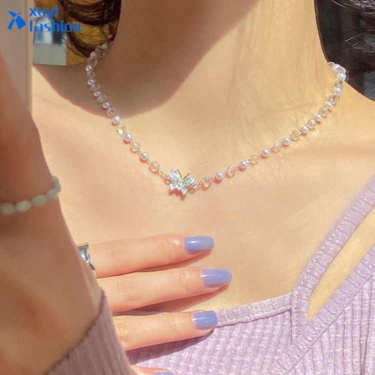 เครื่องประดับสร้อยคอโซ่ลูกปัดคริสตัลเพทายจี้ผีเสื้อสําหรับผู้หญิง