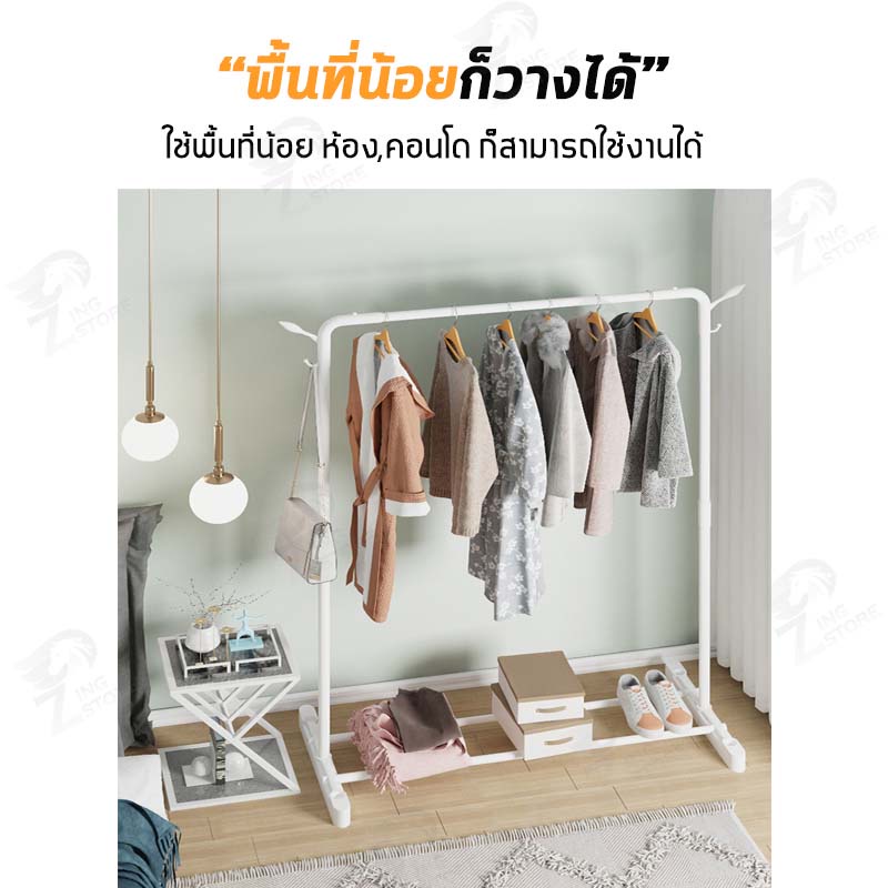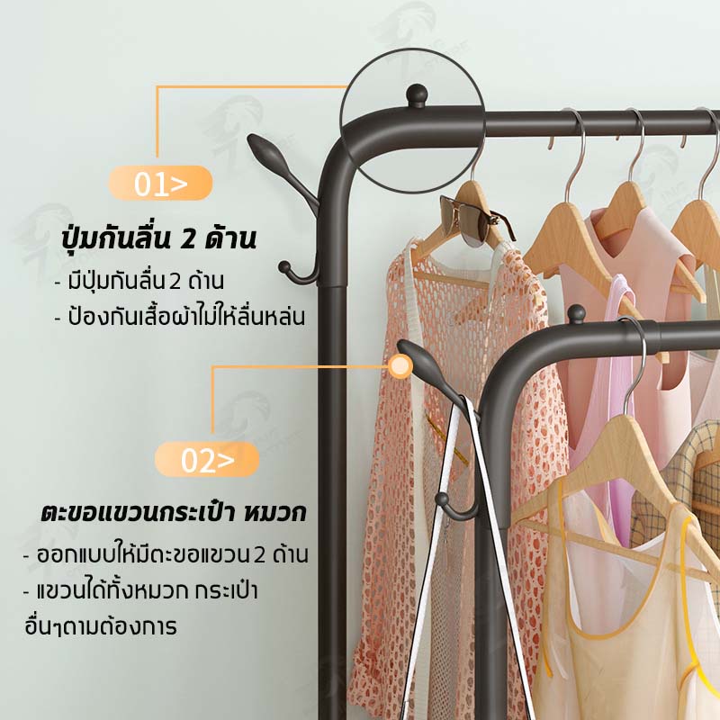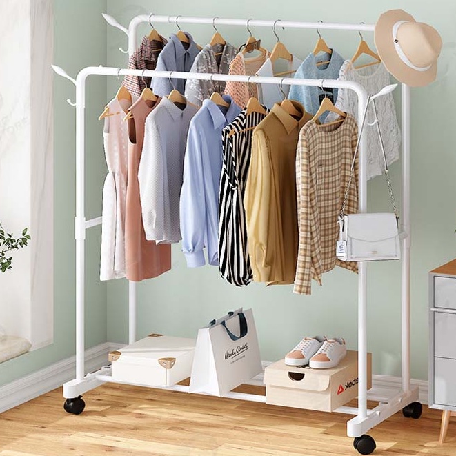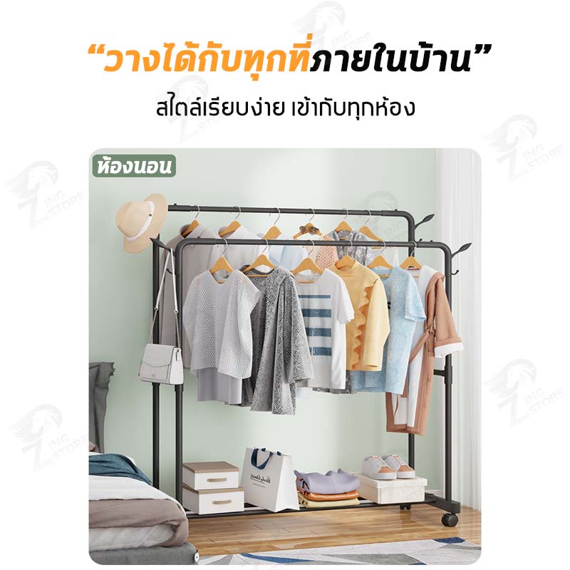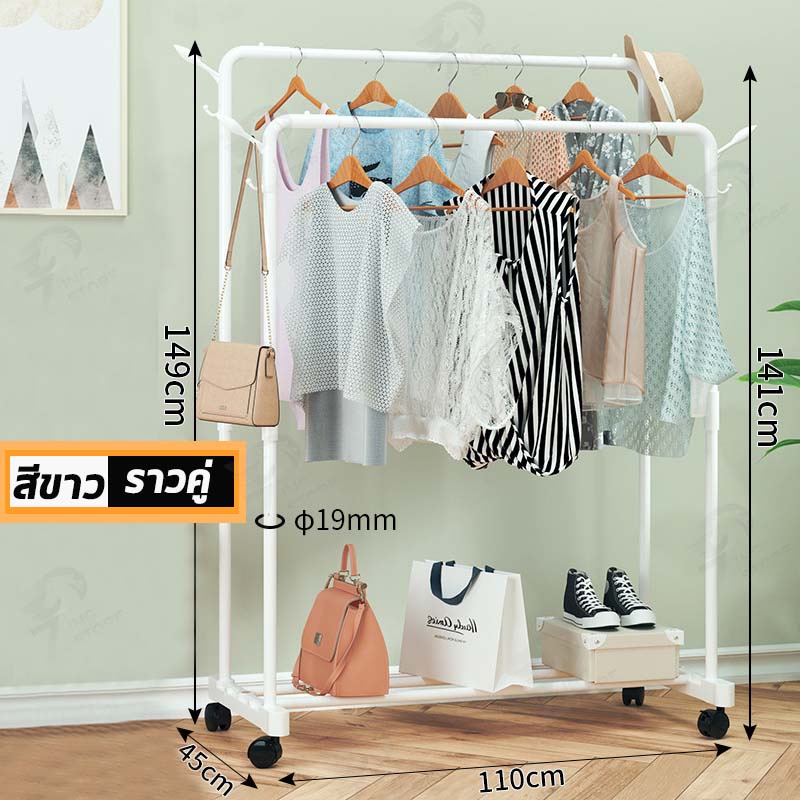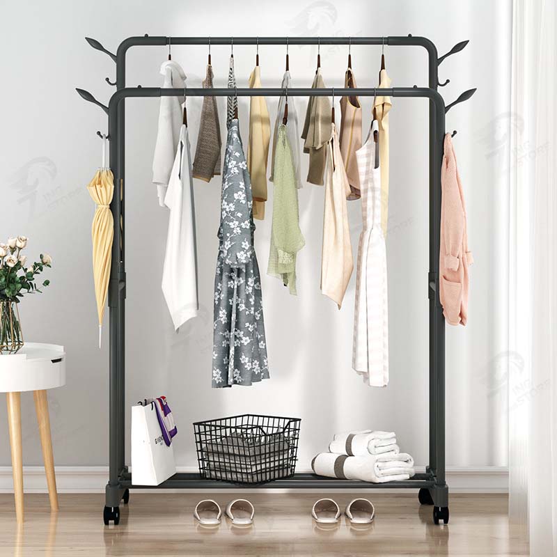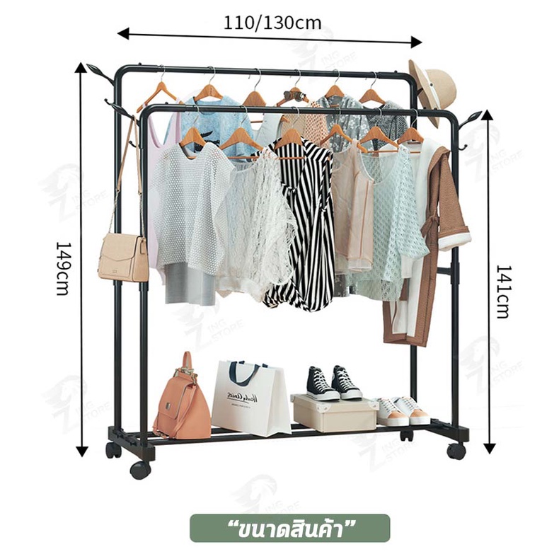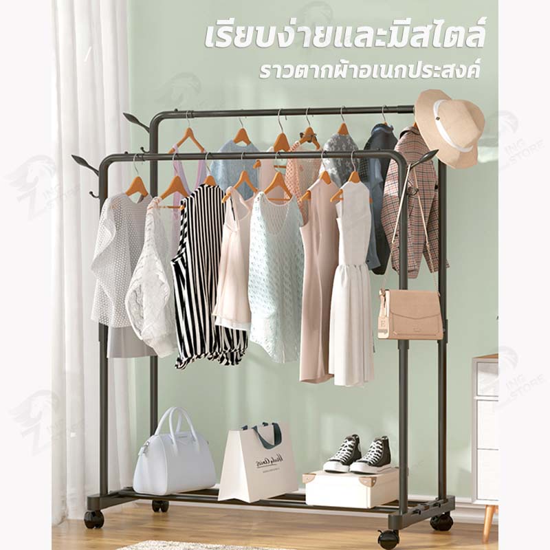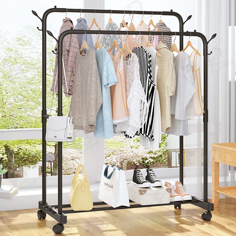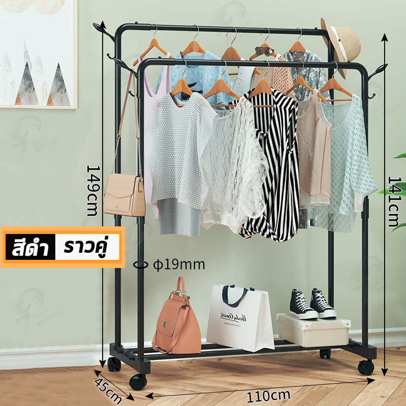 [บาร์คู่พร้อมล้อเลื่อน] ราวเเขวนเสื้อผ้า ราวตากผ้าบาร์คู่ ที่แขวนหมวก ชั้นวางของเหล็ก ที่แขวนเสื้อผ้า+ตะขอ โครงเหล็ก AA8