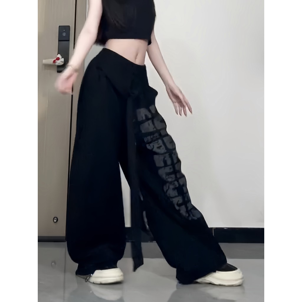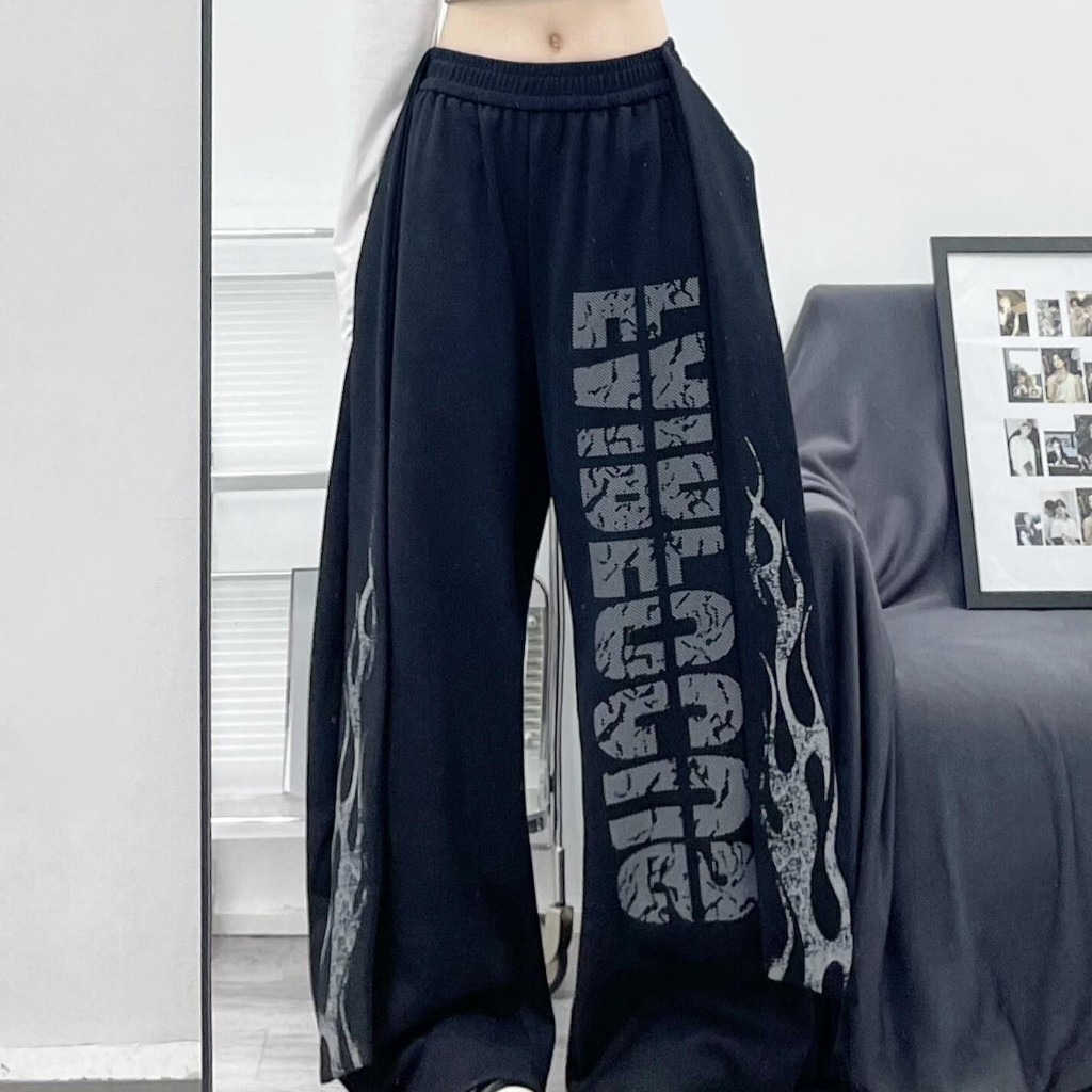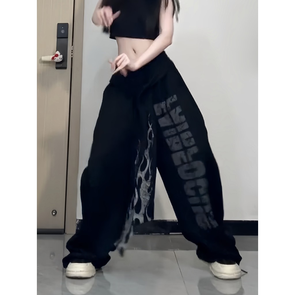 กางเกงวอร์มลำลองริบบิ้นเปลวไฟสไตล์ย้อนยุคอเมริกันสำหรับผู้หญิงคู่รักแนวสตรีท กางเกงขายาวทรงตรงหลวมๆ