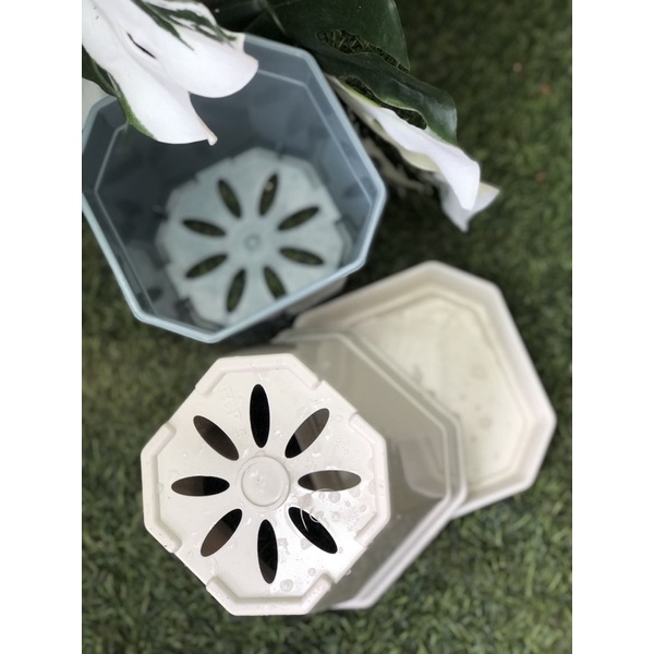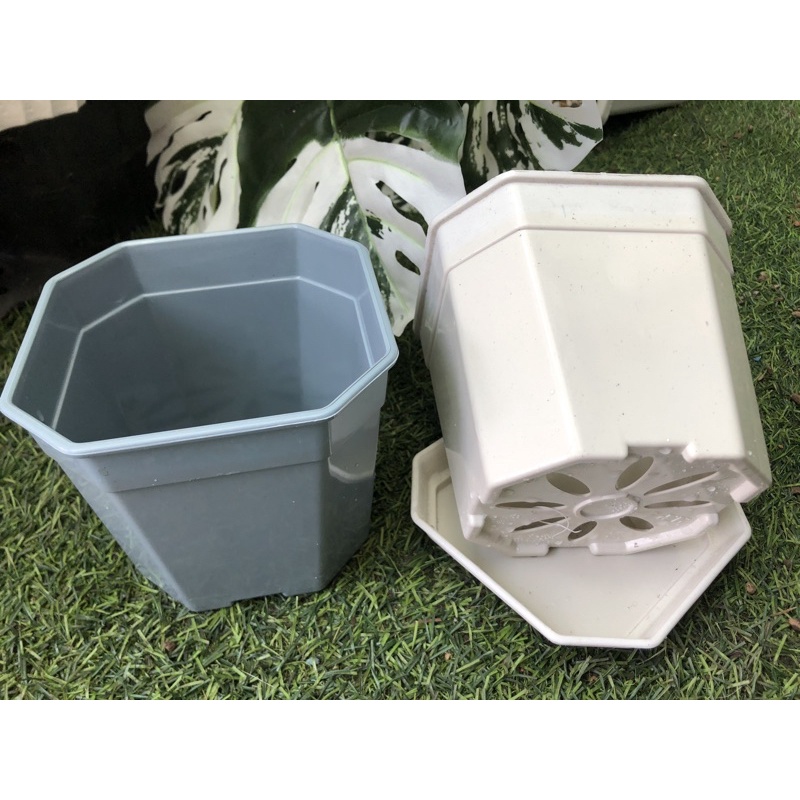 กระถางต้นไม้ กระถางแปดเหลี่ยม พร้อมจานรอง ขนาด 5 นิ้ว มี2สี