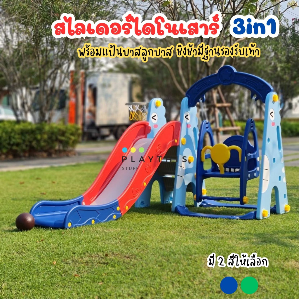 ชิงช้าสไลเดอร์ ไดโนเสาร์ 3in1 แยกประกอบเป็นชิงช้าหรือสไลเดอร์อย่างเดียวได้ ชิงช้ามีฐานรองรับเท้า