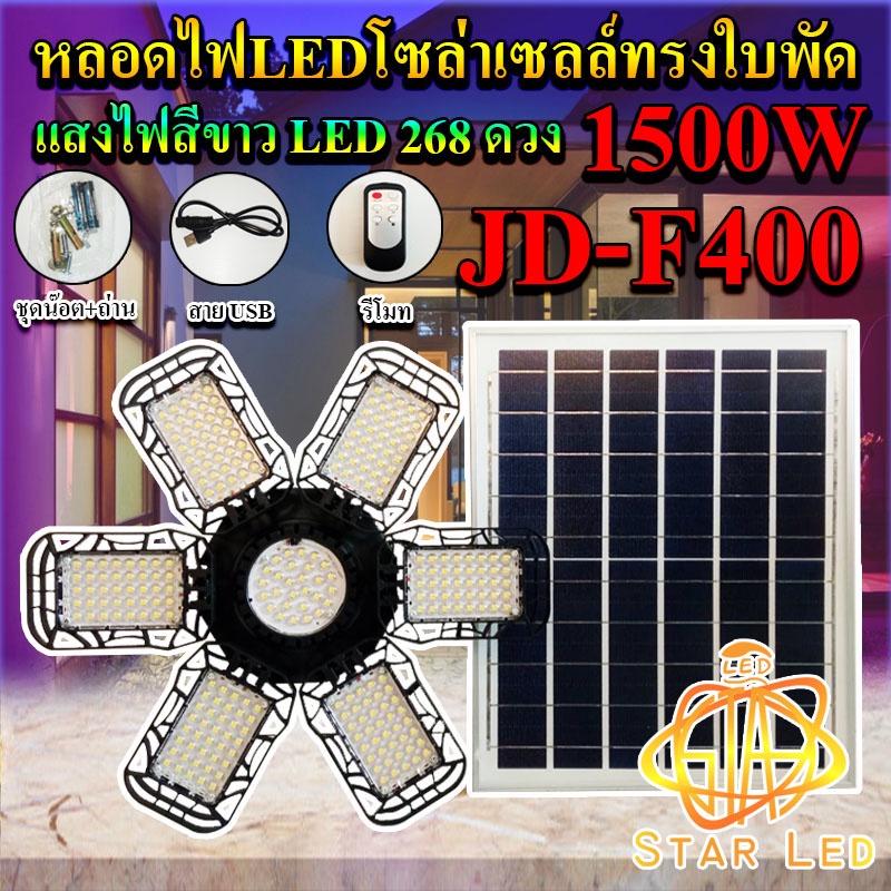 ไฟโซล่าเซลล์ หลอดไฟLED ทรงใบพัด รุ่น JD-F400 1500W พลังงานแสงอาทิตย์ แสงสีขาว พร้อมแผงโซลล่าเซลล์