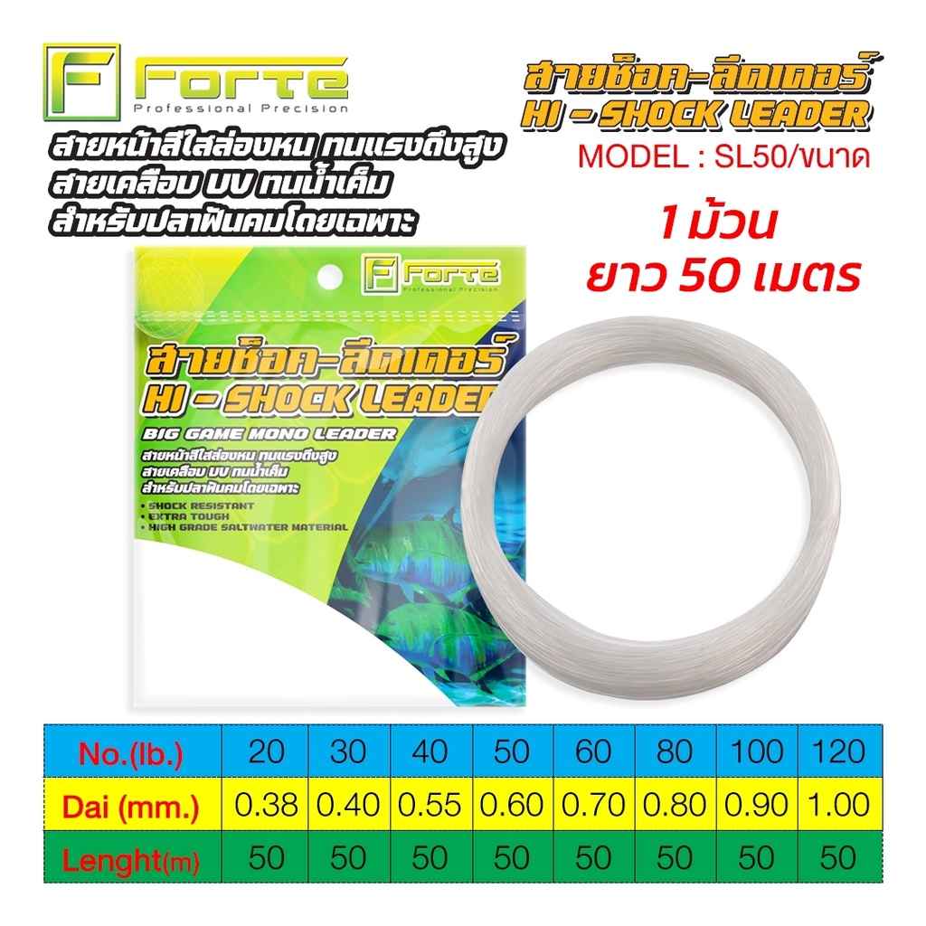 สายช็อคลีด shock leader สายหน้าล่องหน เคลือบ UV Forte ฟอร์เต้ 1 ม้วน 50 เมตร สายใสล่องหน สายช็ อกลีด