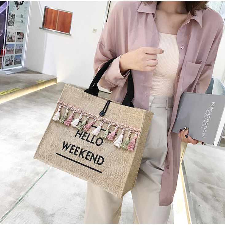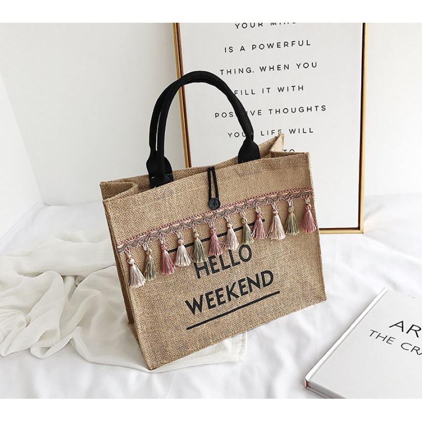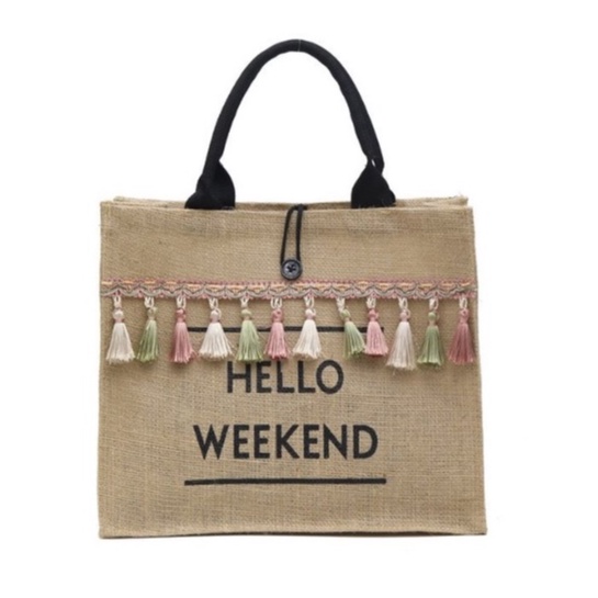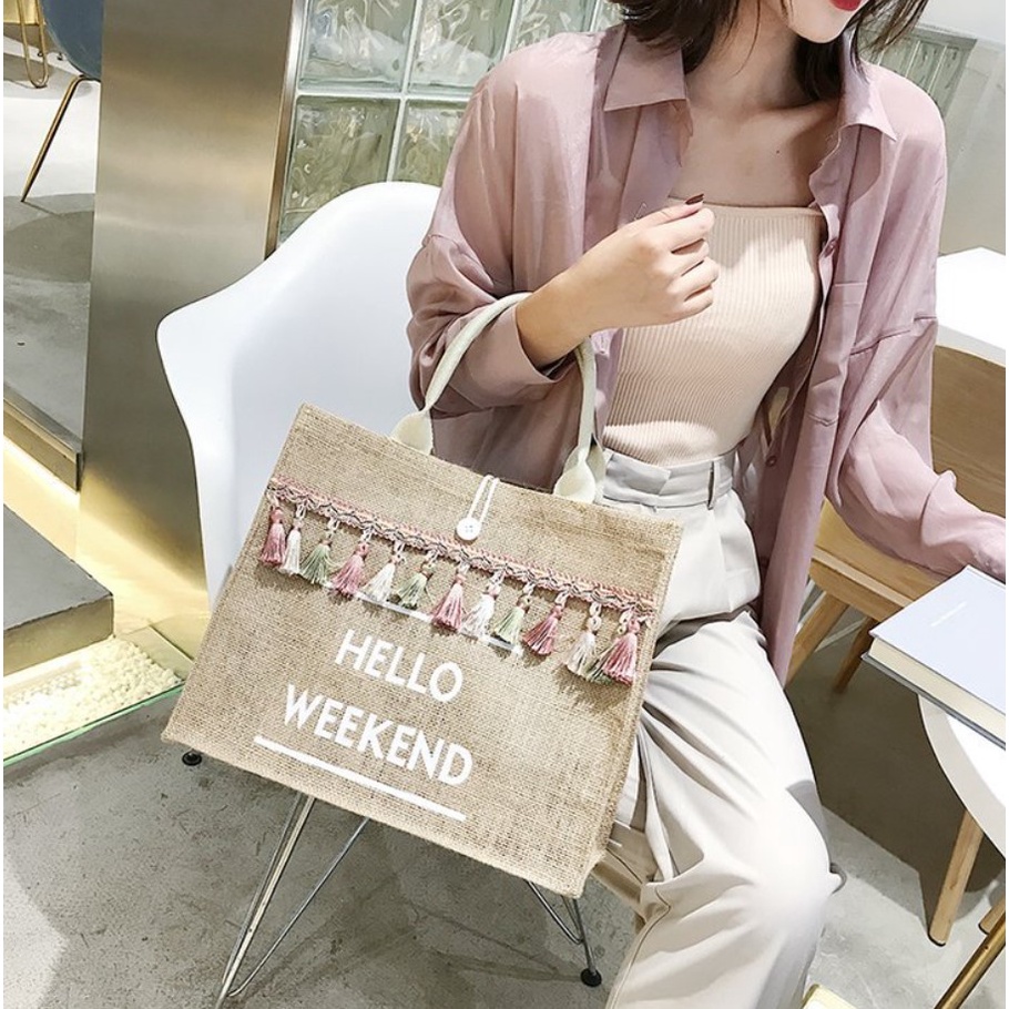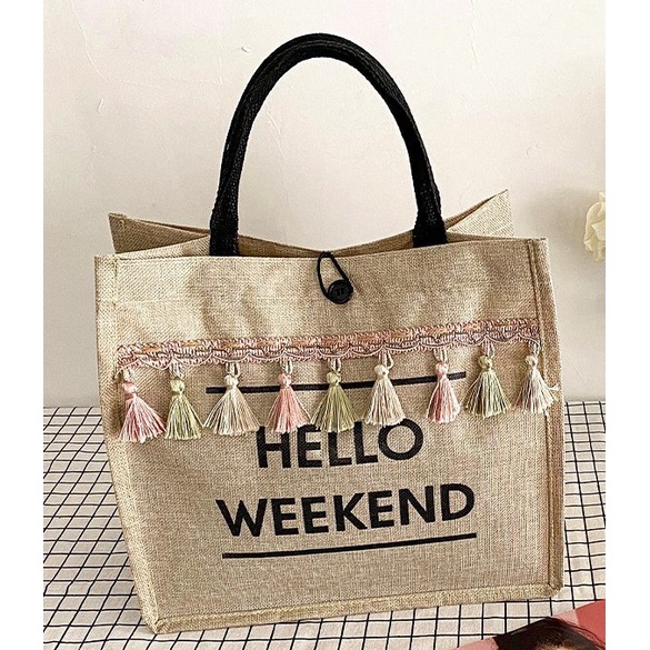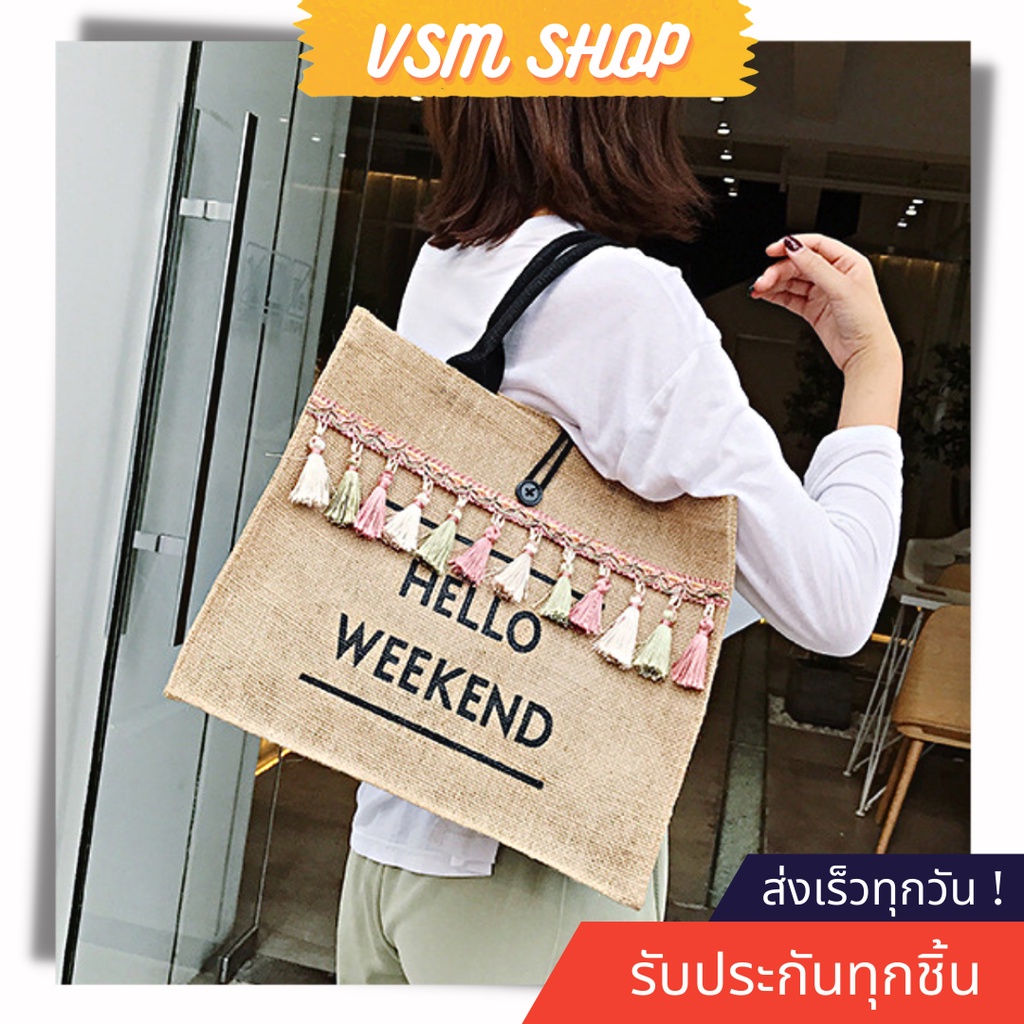 กระเป๋าสาน Hello Weekend แต่งพู่ (A131) กระเป๋าถือสะพายข้าง