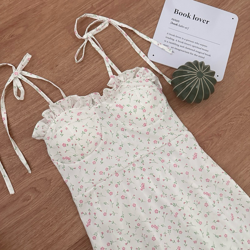 ♦️DOODEE2♦️เดรสสายเดี่ยว ผูกโบว์ เสริมฟองน้ำ ผ้าลายดอกไม้