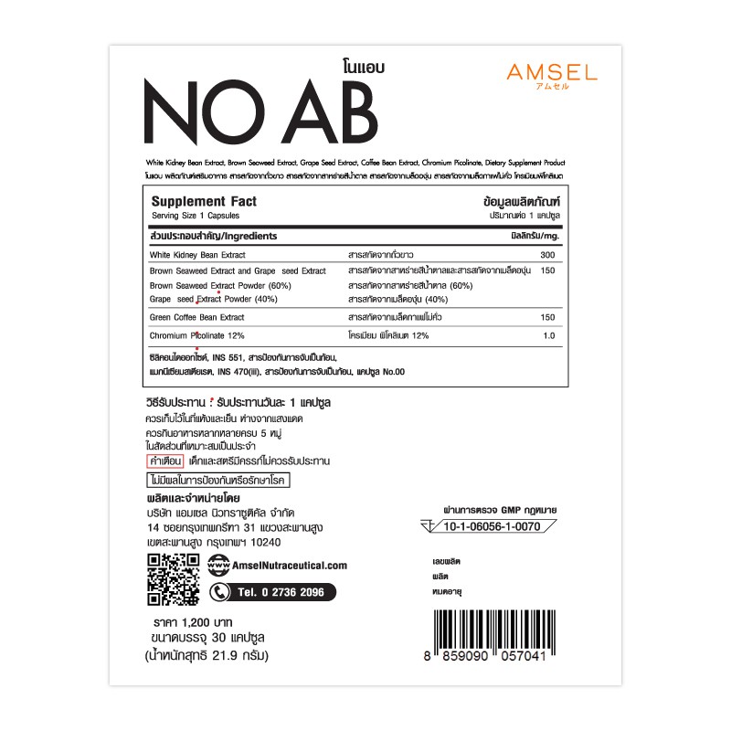 Amsel NO AB 30's แอมเซล โนแอป บล็อคแป้ง ไขมัน และน้ำตาล (30 แคปซูล)