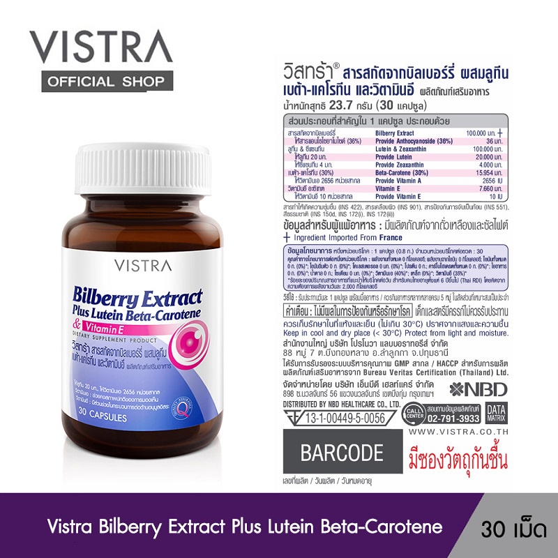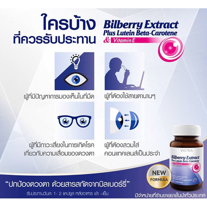 [ส่งฟรี] VISTRA Bilberry Extract Plus Lutein Beta-Carotene (30 Capsule)