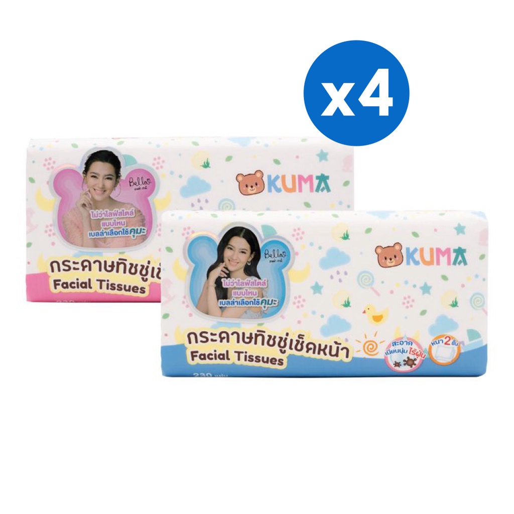 Kuma (คุมะ) กระดาษทิชชู่ บรรจุ 230 แผ่น หนา 2 ชั้น คละสี (1 ห่อ) x4