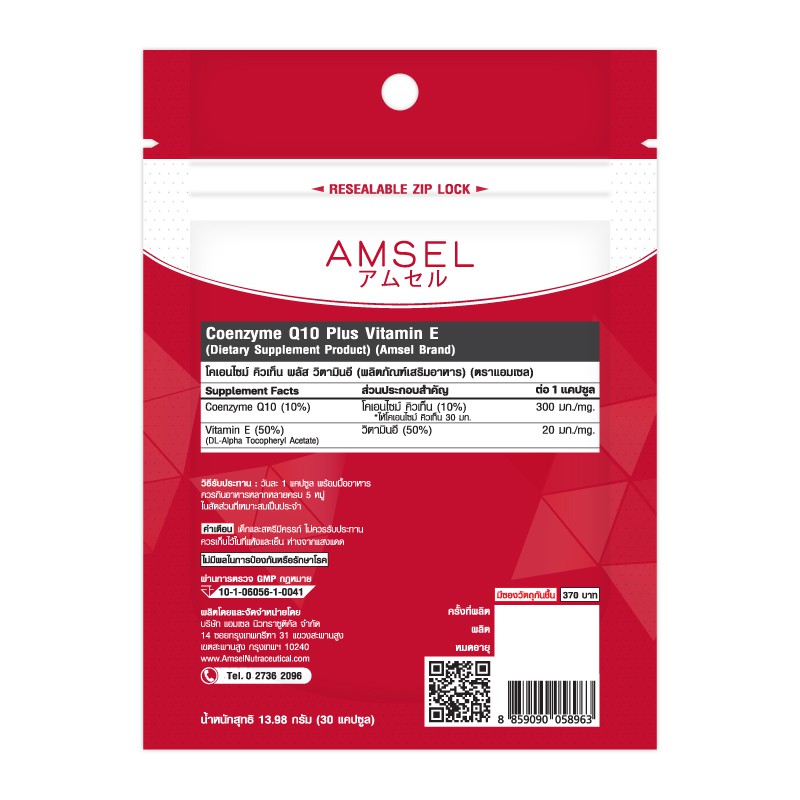 Amsel Coenzyme Q10 Plus Vitamin E (30 แคปซูล Ziplock) 13.98g