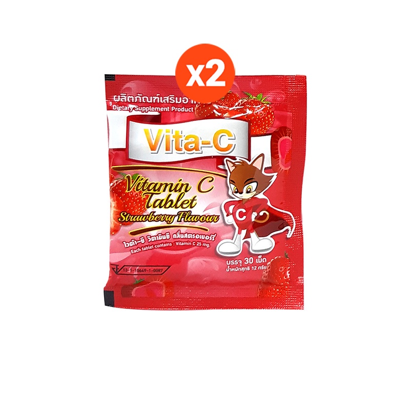 [2 ซอง] Vita-C Vitamin C Tablet Strawberry Flavors 30 Tablets ไวต้า-ซี วิตามินซี กลิ่นสตรอเบอรี่ 30 เม็ด