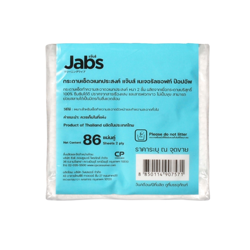 Jabs แจ๊บส์ เนเจอรัล ซอฟท์ กระดาษป๊อปอัพ จำนวน 86 แผ่นคู่ หนา 2 ชั้น x1 แพ็ค