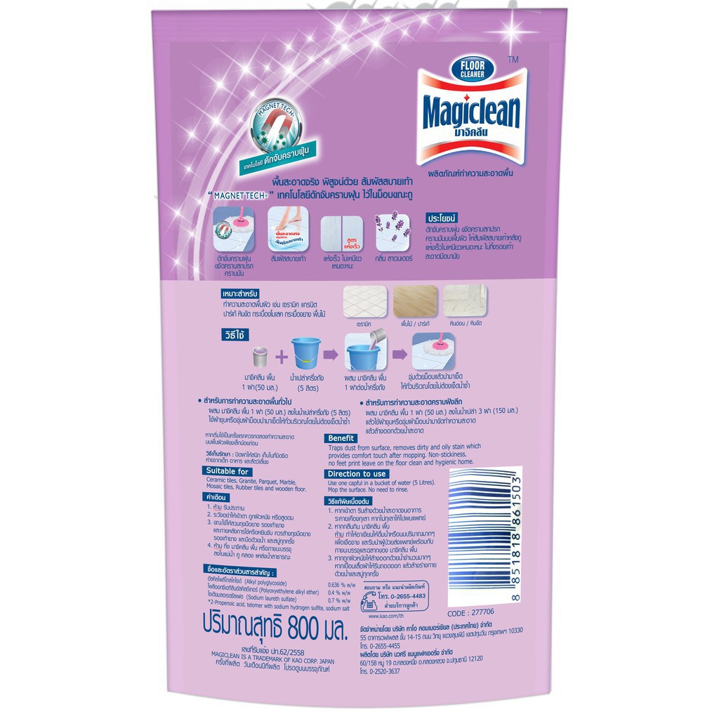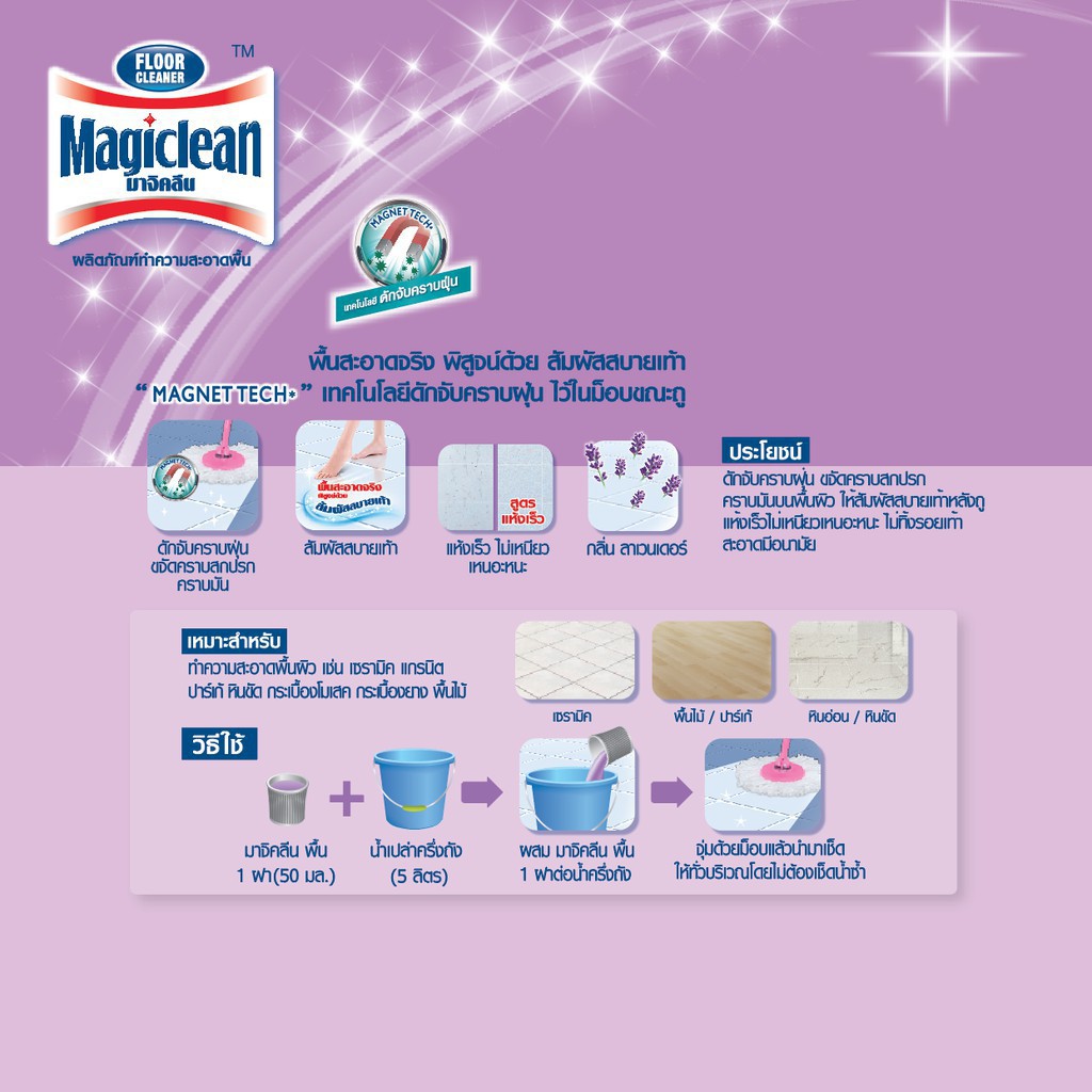 มาจิคลีน น้ำยาถูพื้น ลาเวนเดอร์ แพ็ค 2 ถุงเติม 750 มล Magiclean Floor cleaner Lavender pack2 refill 750 ml