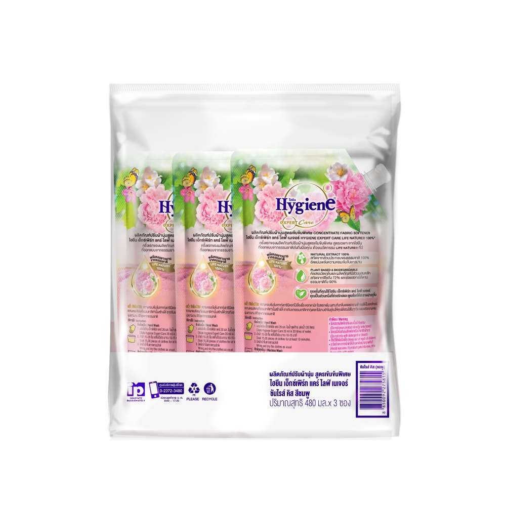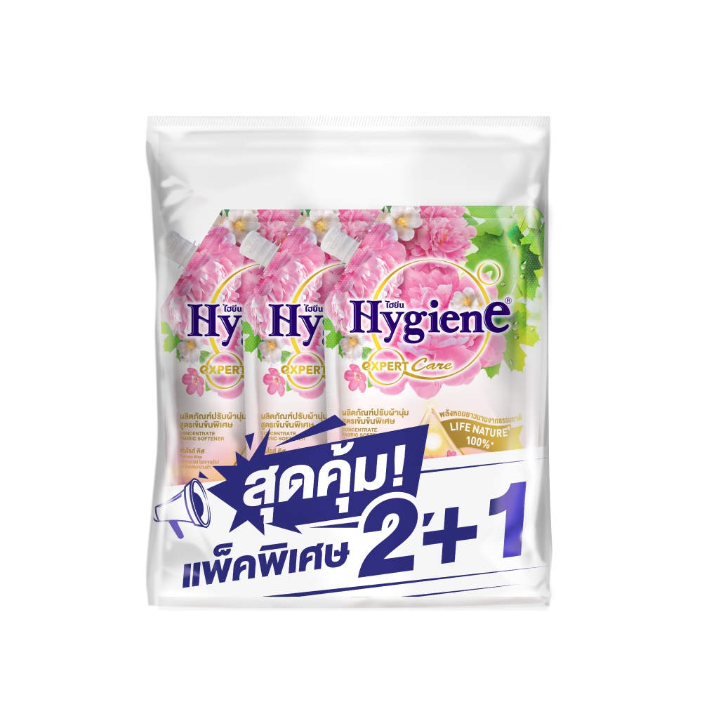 HYGIENE ไฮยีน เอ็กซ์เพิร์ท แคร์ ไลฟ์เซ้นท์ น้ำยาปรับผ้านุ่มสูตรเข้มข้นพิเศษ กลิ่นซันไรส์ คิส(สีชมพู) 480มล.