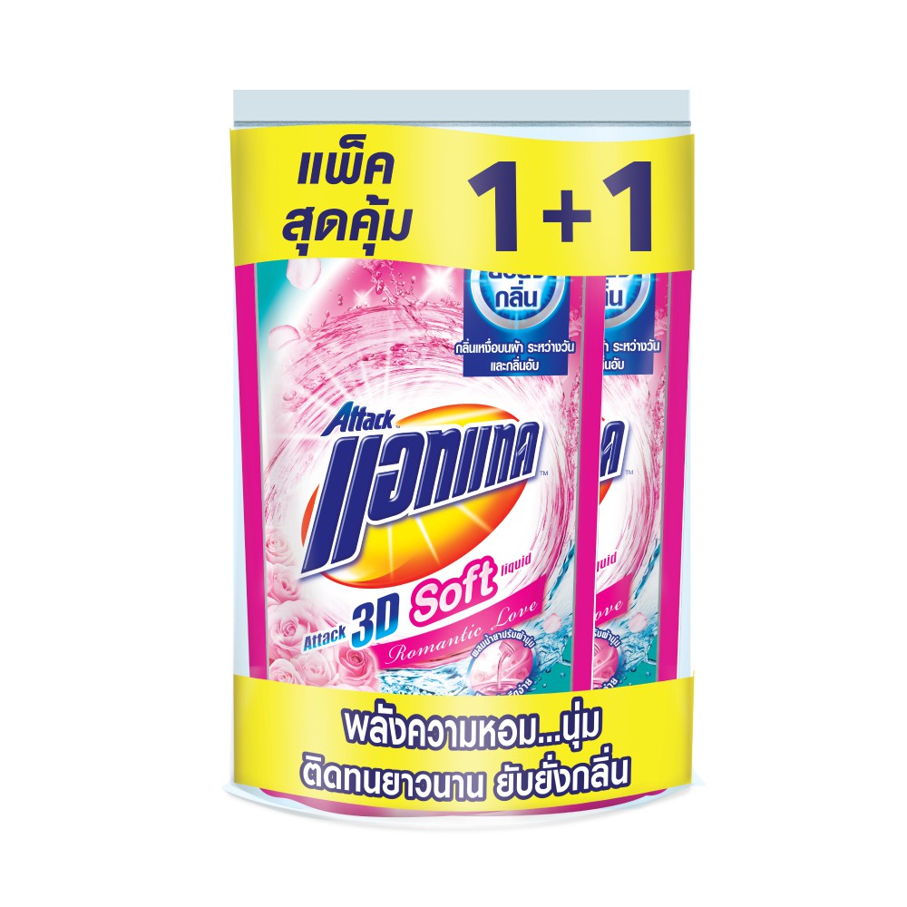 [แพ็ค 1+1] แอทแทค 3D ซอฟท์ โรแมนติกเลิฟ น้ำยาซักผ้าสูตรเข้มข้น ขนาด 630 มล.
