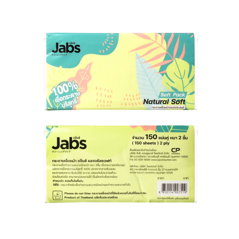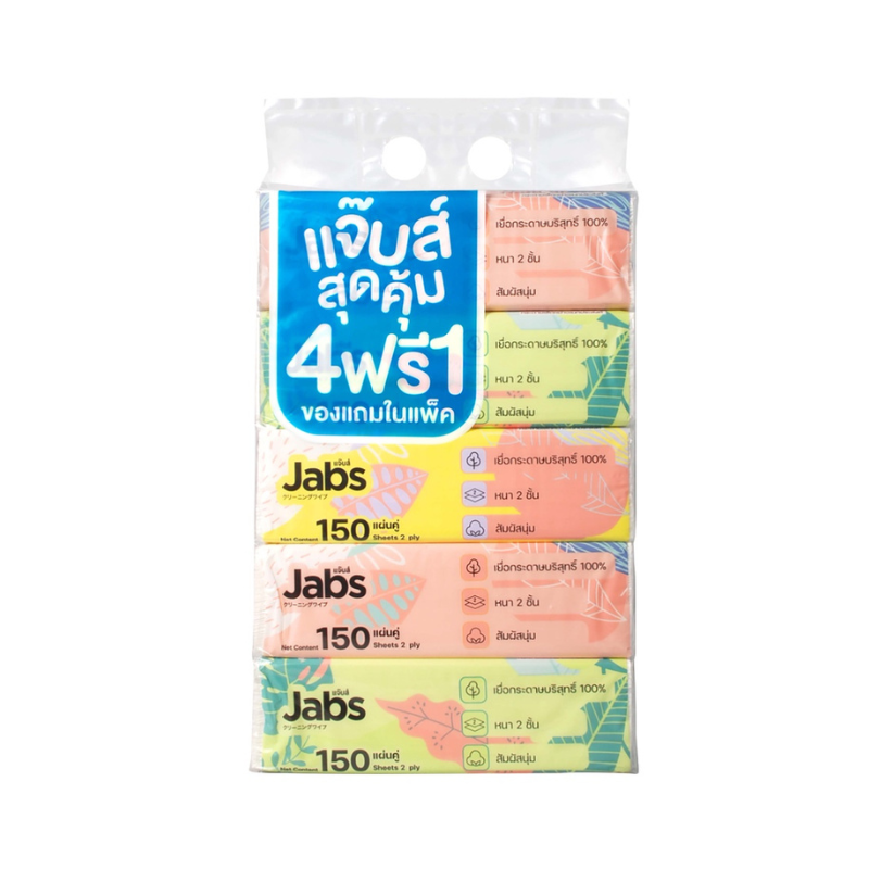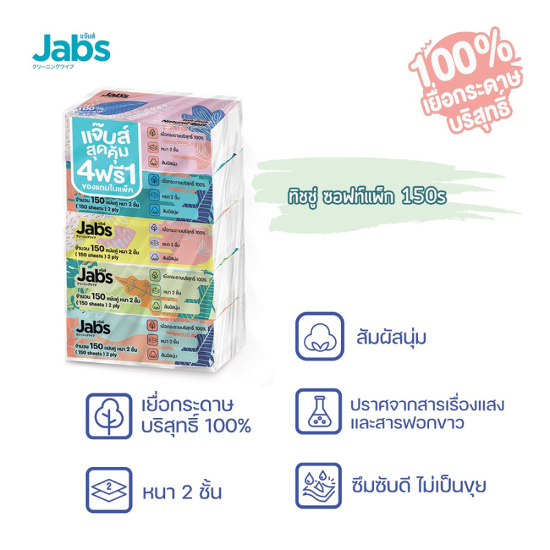 Jabs แจ๊บส์ เนเจอรัล ซอฟท์ กระดาษเช็ดหน้า ซอฟท์แพ็ค 2 ชั้น 150 แผ่นคู่ หนา 2 ชั้น ( แพ็ค 4 ฟรี 1)