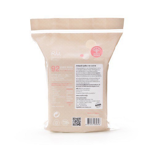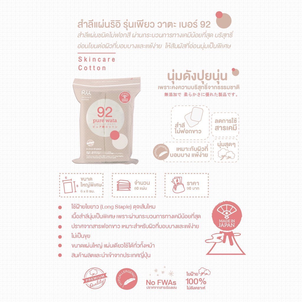 Rii สำลีแผ่นริอิ รุ่นเพียว วาตะ เบอร์ 92 อ่อนโยนต่อผิวที่บอบบางและแพ้ง่าย ซองละ 80 แผ่น