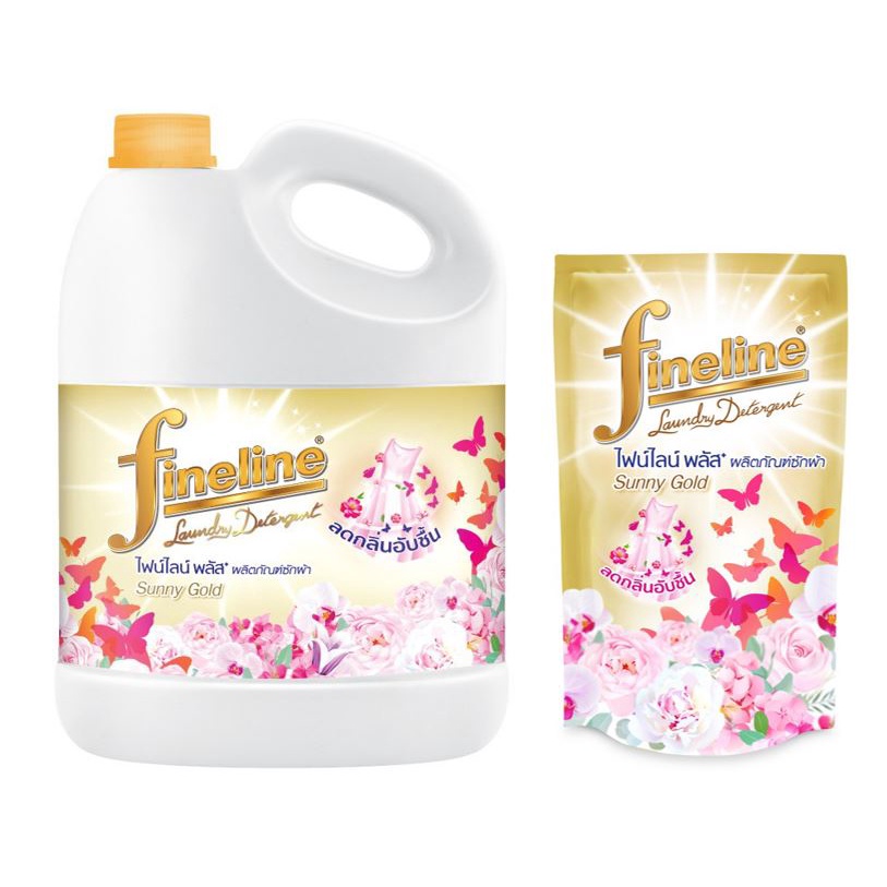[เซ็ทสุดคุ้ม] Finelineไฟน์ไลน์ซักผ้า สูตรลดกลิ่นอับชื้น สีทอง กลิ่นซันนี่โกลด์ 3000มล+ถุงสีทอง ขนาด400มล
