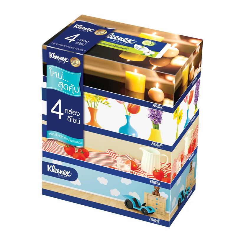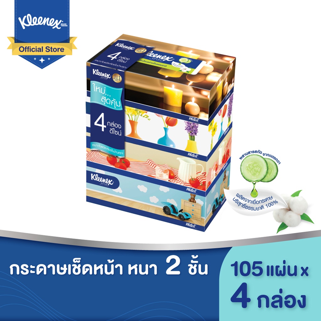 คลีเน็กซ์ รูมดีไซน์ บ๊อกซ์ กระดาษเช็ดหน้า หนา2ชั้น 105แผ่น แพ็ค 4 กล่อง Kleenex Facial Tissue (2Ply) Box Pack4