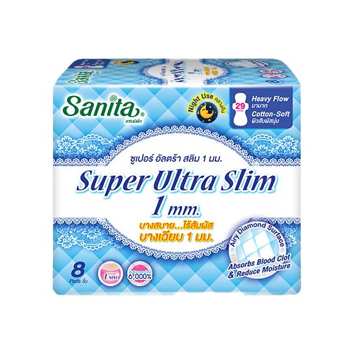 Sanita แซนนิต้า ซูเปอร์อัลตร้าสลิม รุ่นนบางเฉียบ 1 มม. มีปีก ความยาว 29 ซม. ผิวสั มผัสนุ่ม สำหรับกลางคืน (8 ชิ้น)