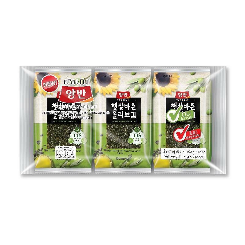 Yangban ยังบัน สาหร่ายเกาหลี สาหร่ายทะเลปรุงรสด้วยน้ำมันมะกอกและน้ำมันทานต ะวัน 4กรัม แพ็ค 3