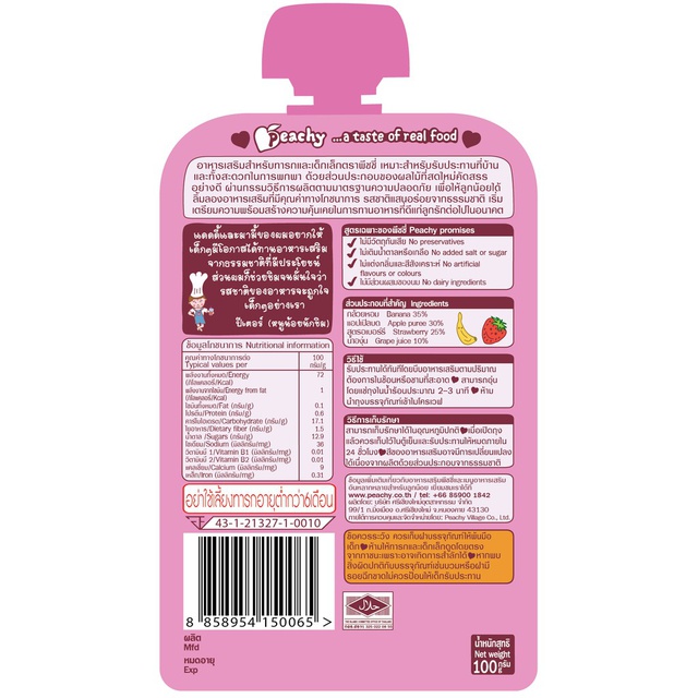 Peachy สมูทตี้สำหรับเด็กพีชชี่ รสสตรอเบอร์รี่ผสมกล้วย 1 ถุง (R6)100g.