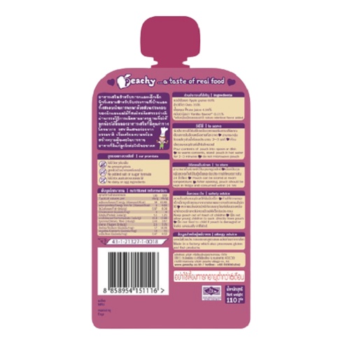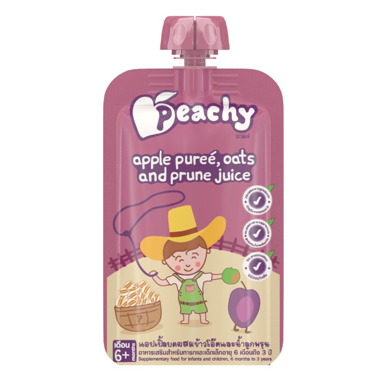 [ซื้อ 3ชิ้นลด10%] Peachy อาหารเสริมพีชชี่ รสแอปเปิลบดผสมข้าวโอ๊ตและน้ำพรุน 1 ถุง (R20)110g.