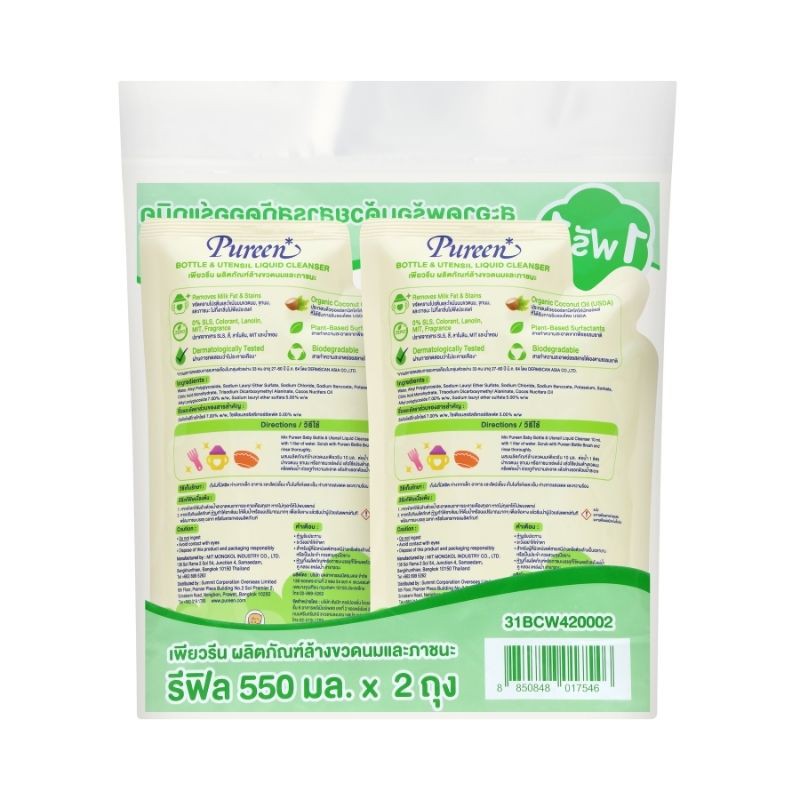 Pureen organic bottle&utensil liquid cleanser refill 550 ml Pack2 Pureen น้ำยาล้างขวดนม สูตรออร์แกนิค แพคคู่