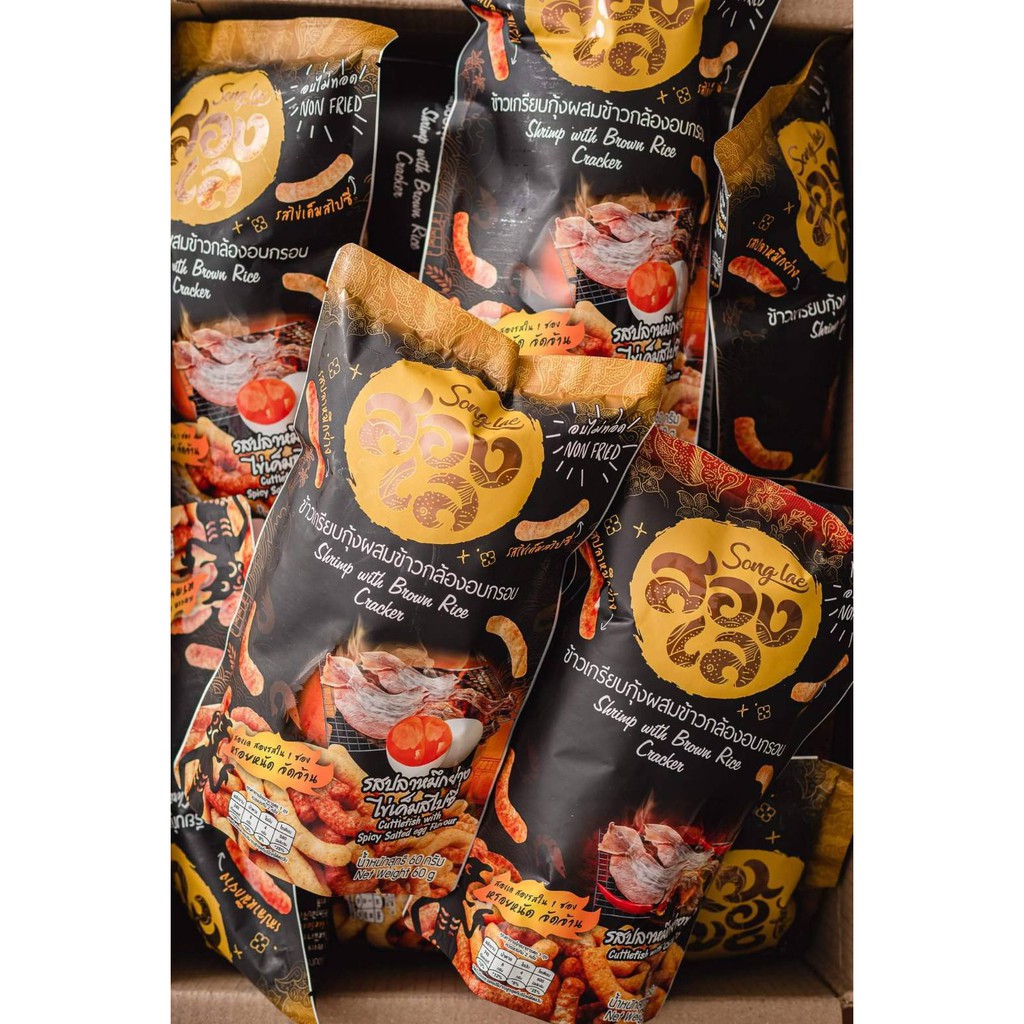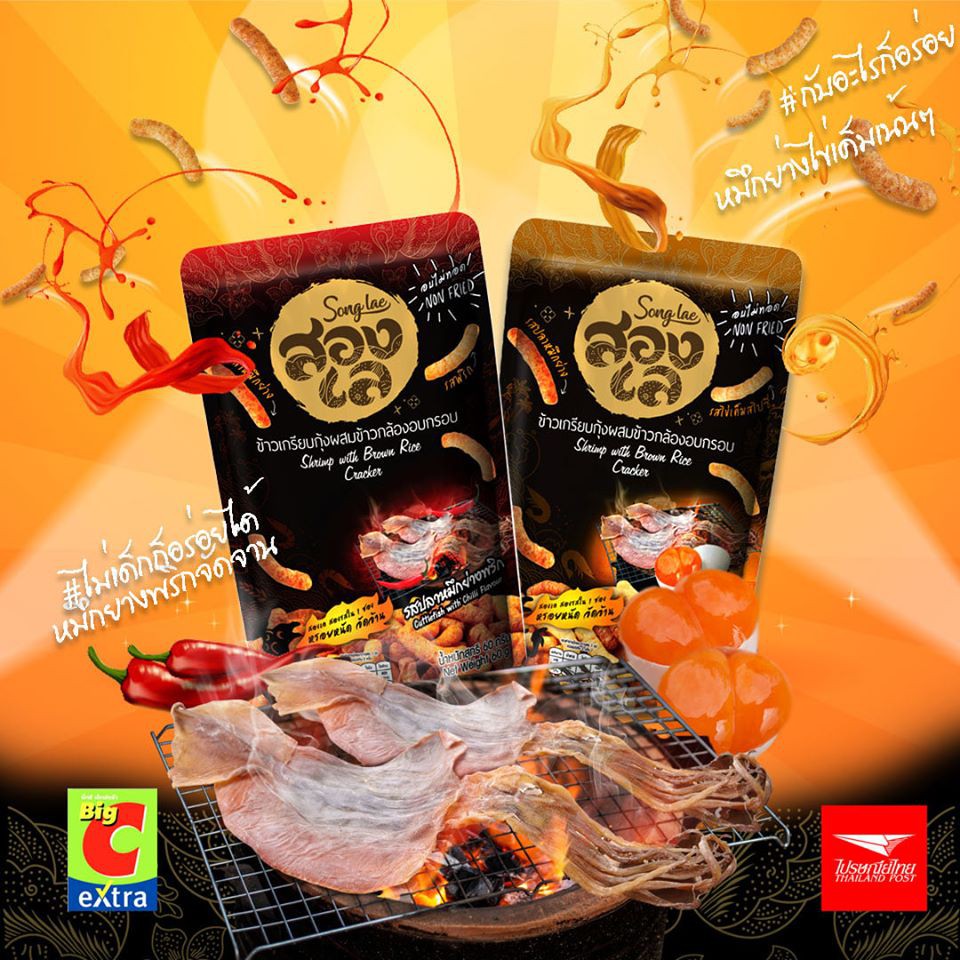 สองเล ข้าวเกรียบกุ้งผสมข้าวกล้องอบกรอบ แพ็ค 4 ห่อ คละรส ปลาหมึกย่างพริกและปลาหมึกย่างไข่เค็มสไปซี่