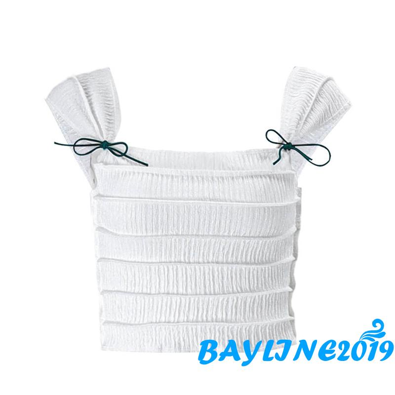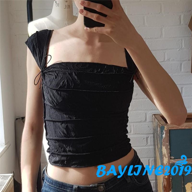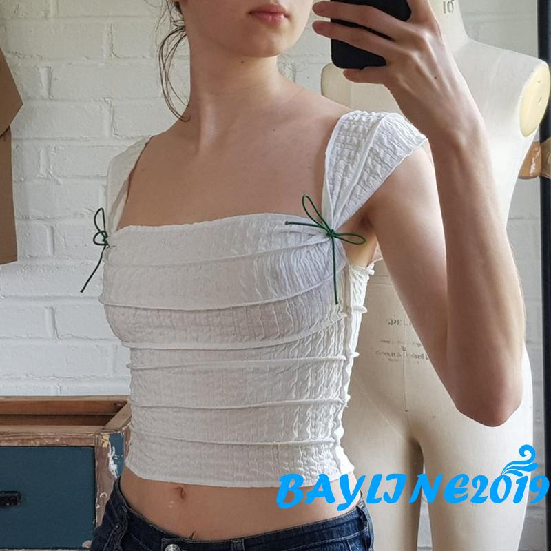 Bay-womens Casual เสื้อแขนกุดแฟชั่นสีทึบ Tie-up Square Collar สัมผัสสะดือเสื้อกั๊กจีบ