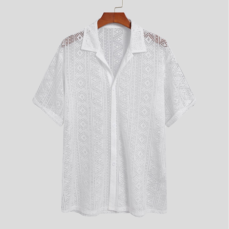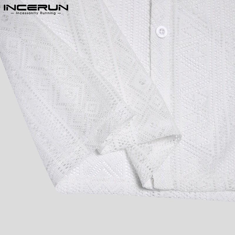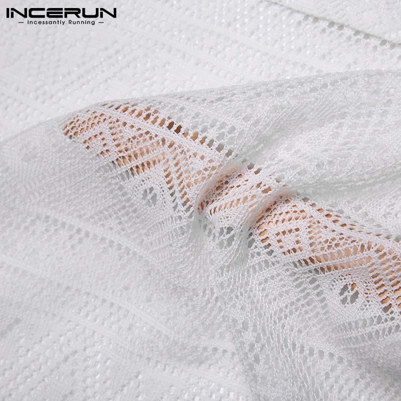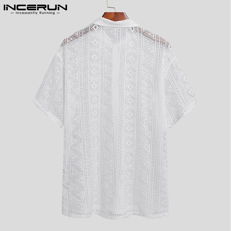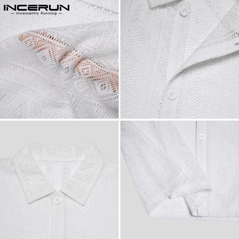 Incerun เสื้อเชิ้ต ซีทรู คอปก แขนครึ่งแขน สีขาว เซ็กซี่ สำหรับผู้ชาย