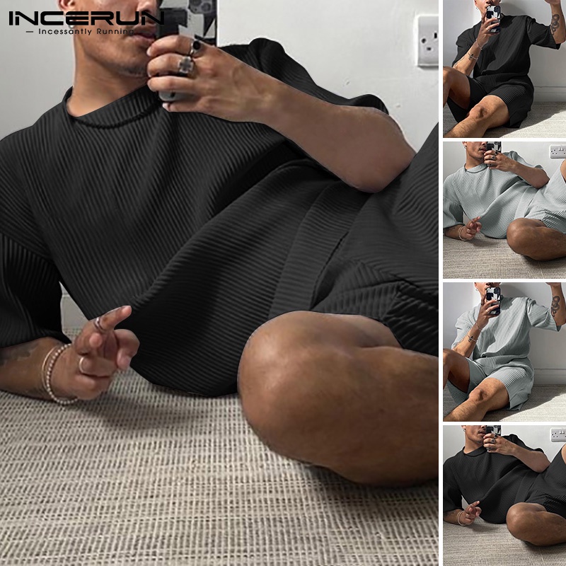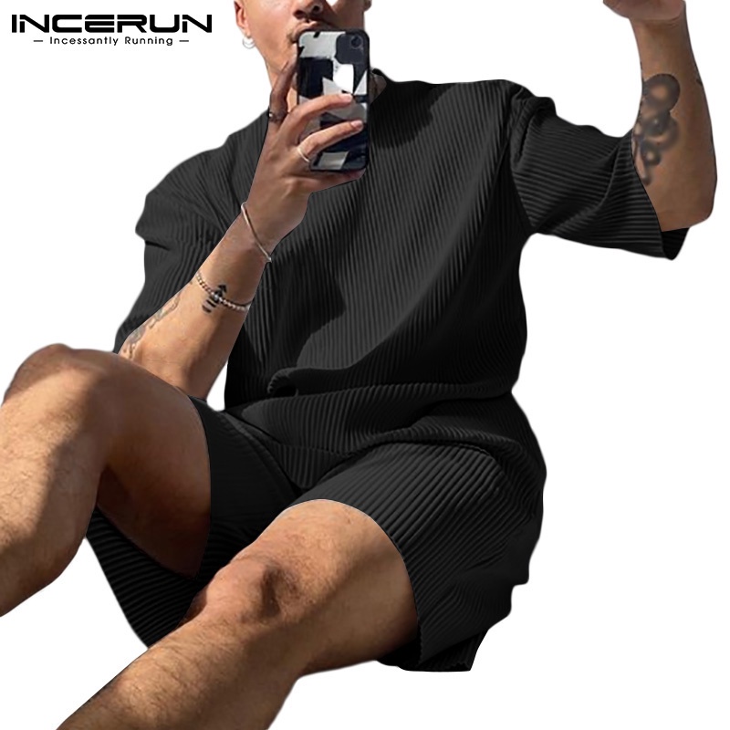 INCERUN ชายฤดูร้อนลายเสื้อยืดแขนสั้น + กางเกงขาสั้นชุดลำลองหลวม